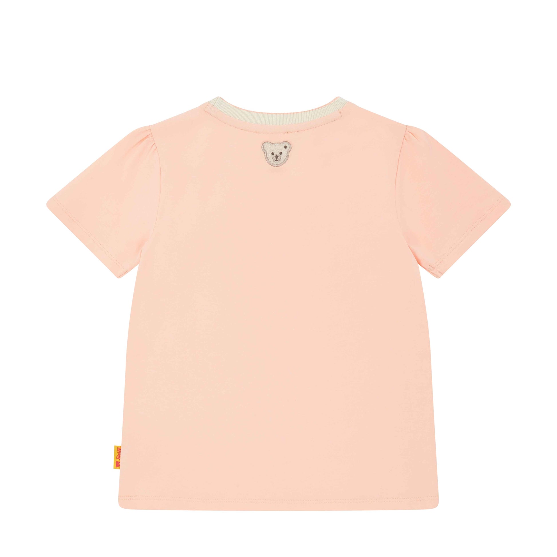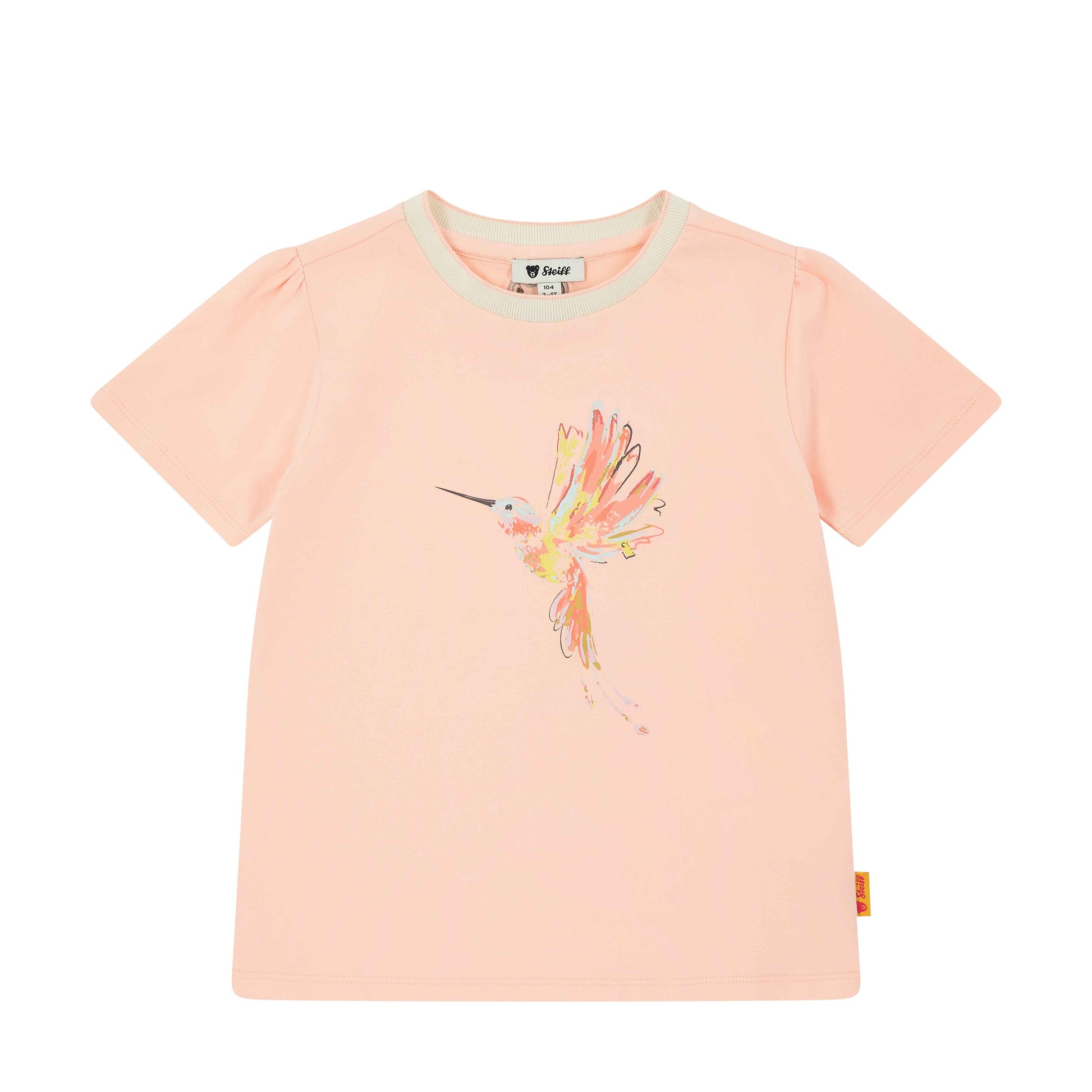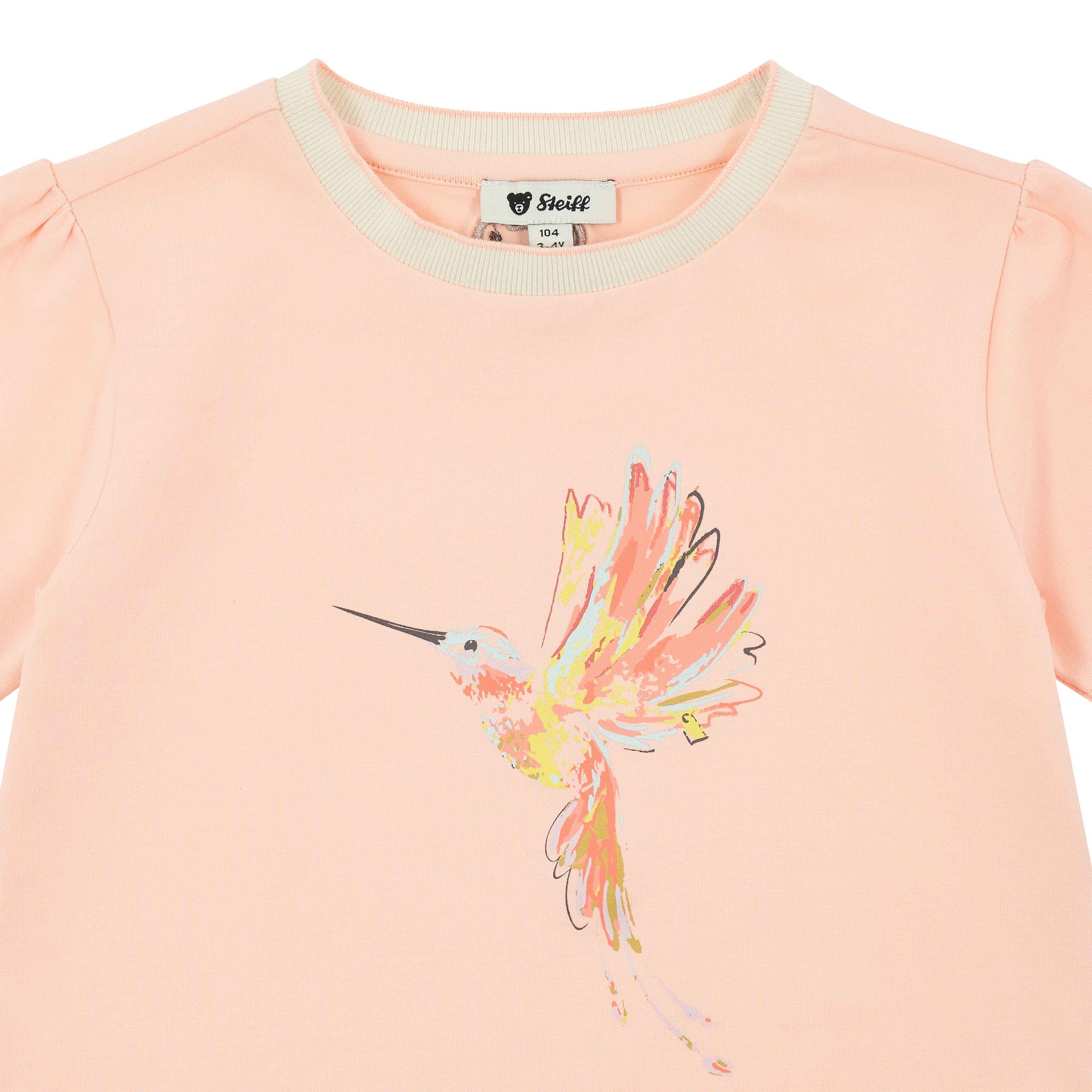 Dieses kurzärmelige T-Shirt in sanftem Pfirsichton bringt frischen Zauber in die Garderobe kleiner Träumerinnen. Der lockere Schnitt und der weiche Jersey-Stoff bieten ein herrlich gemütliches Tragegefühl und viel Bewegungsfreiheit. Ein zauberhafter Kolibri-Print auf der Vorderseite und der kontrastreiche Rippkragen mit Streifendetail verleihen dem Shirt eine fröhliche Note. Das flauschige Steiff Teddybärmotiv am Rücken rundet den Look liebevoll ab und macht das Shirt zu einem wundervollen Lieblingsstück für kleine Entdeckerinnen.