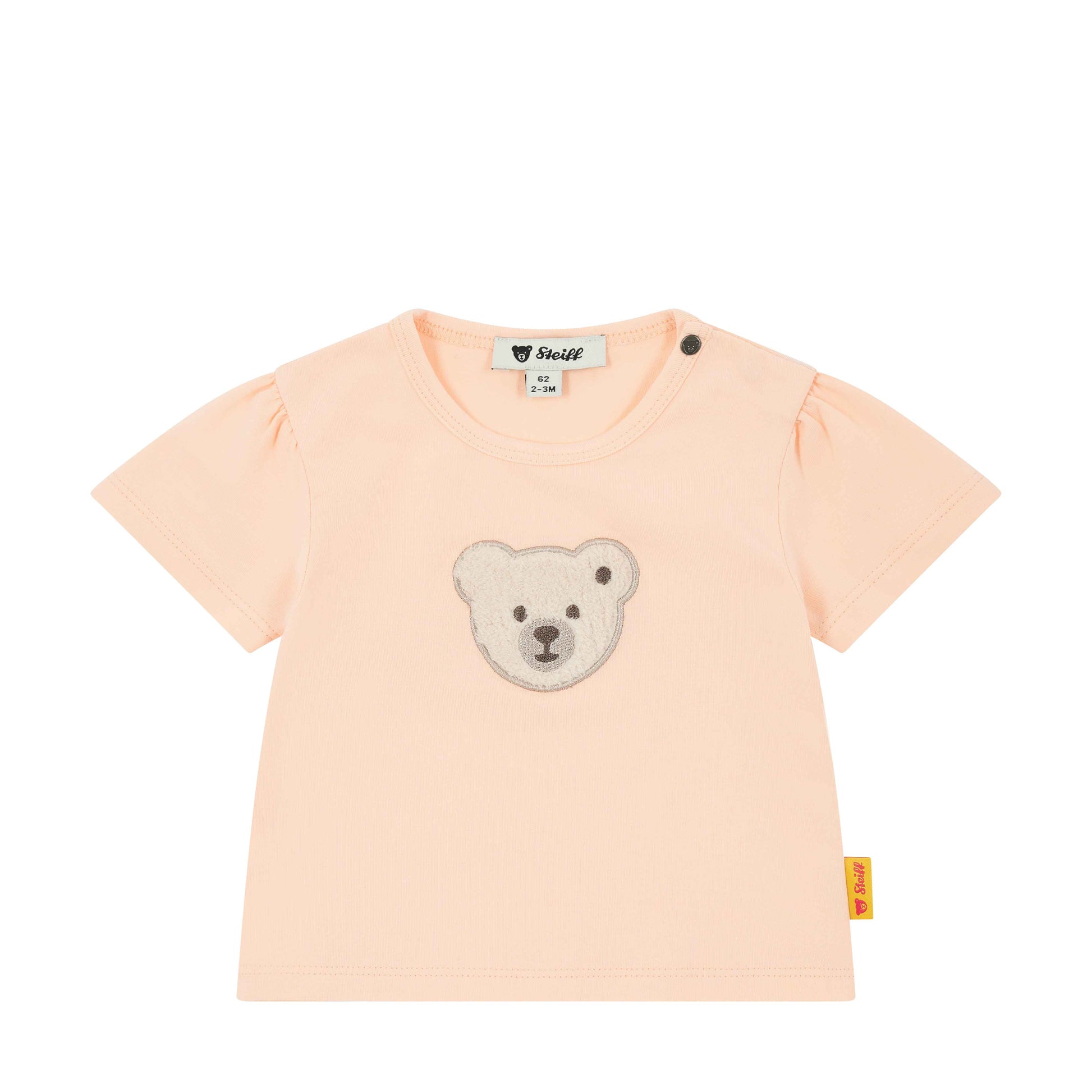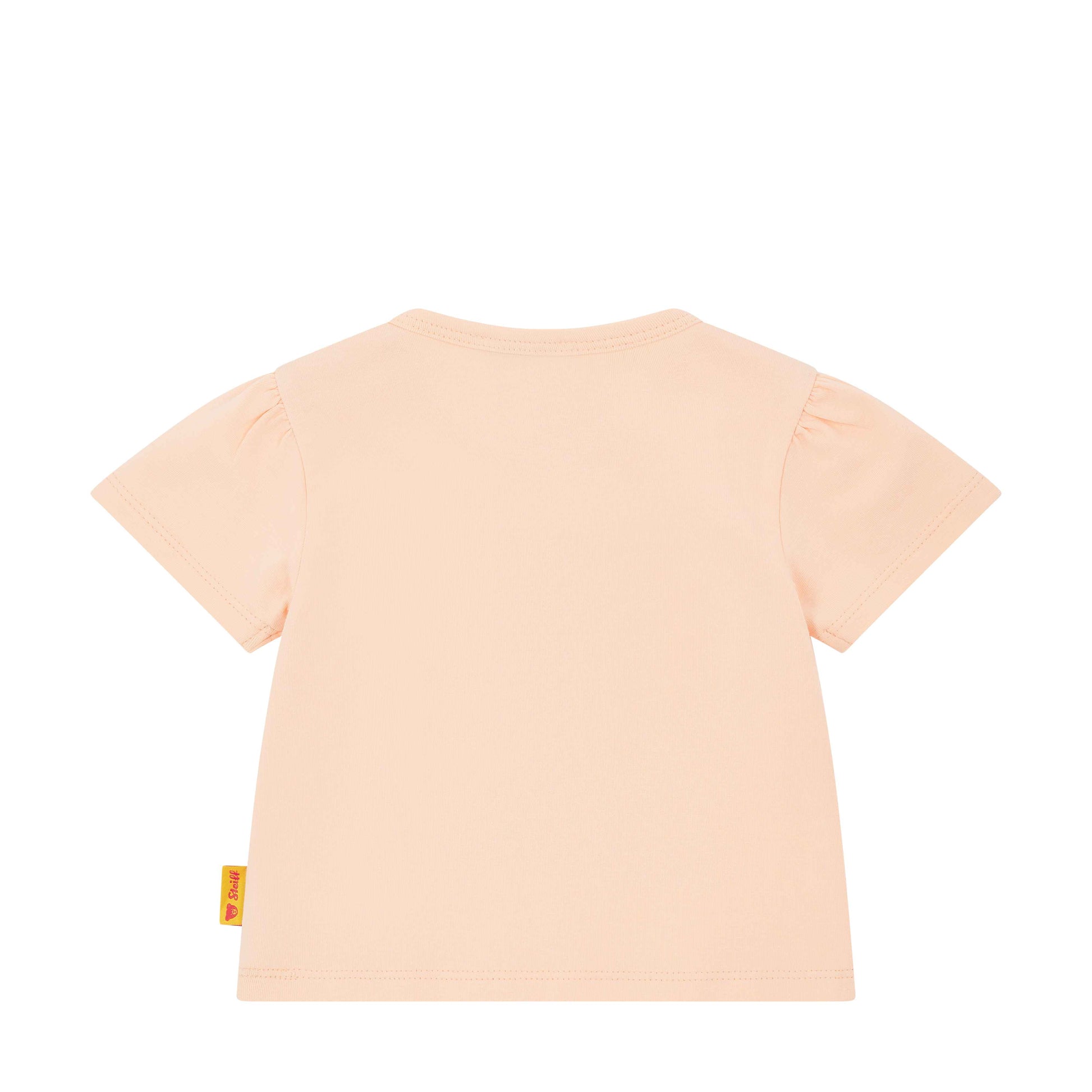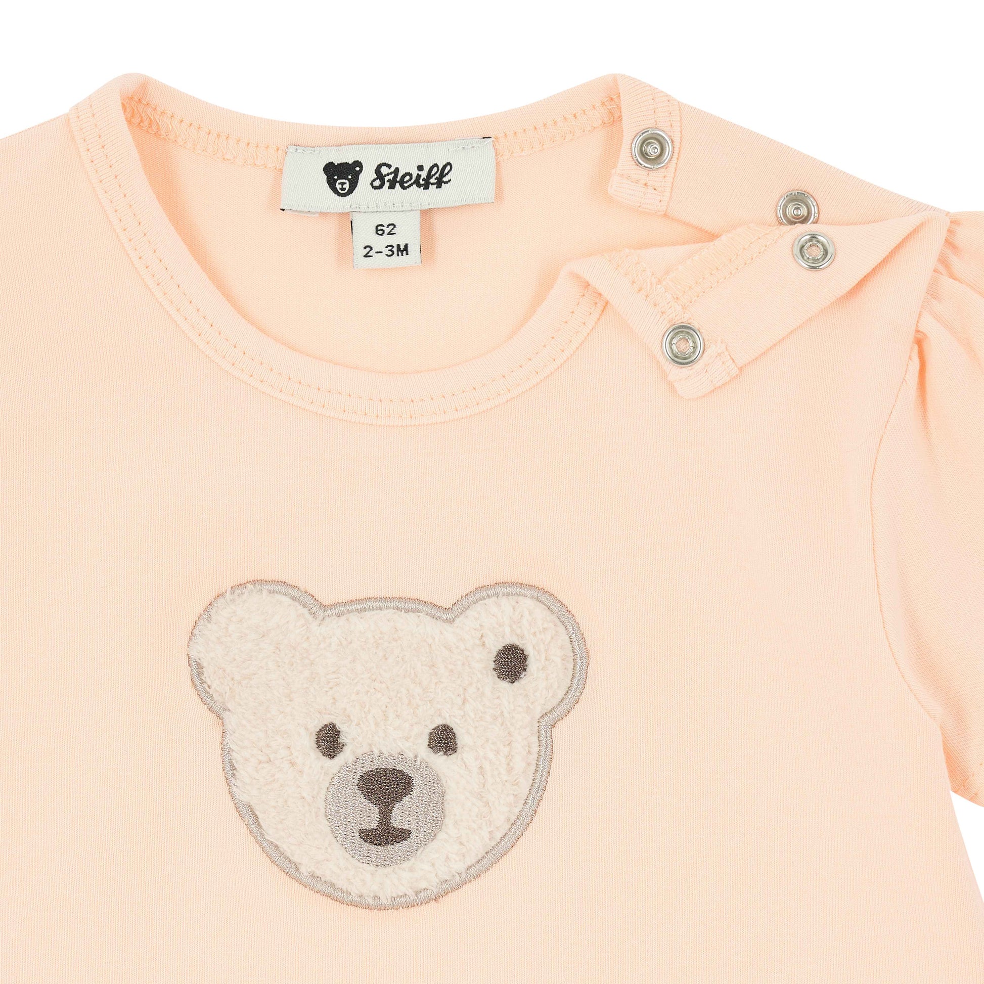 Dieses kurzärmelige T-Shirt in zartem Pfirsichton ist ein wunderschöner Hingucker für kleine Prinzessinnen. Der weiche Jersey-Stoff sorgt für ein angenehmes Tragegefühl und lässt durch den lockeren Schnitt viel Bewegungsfreiheit. Druckknöpfe an der Schulter erleichtern das An- und Ausziehen. Das große, flauschige Steiff Teddybärmotiv auf der Vorderseite schenkt dem Shirt eine liebevolle Note und zaubert jedem ein Lächeln ins Gesicht – ideal für fröhliche Entdeckungstouren.