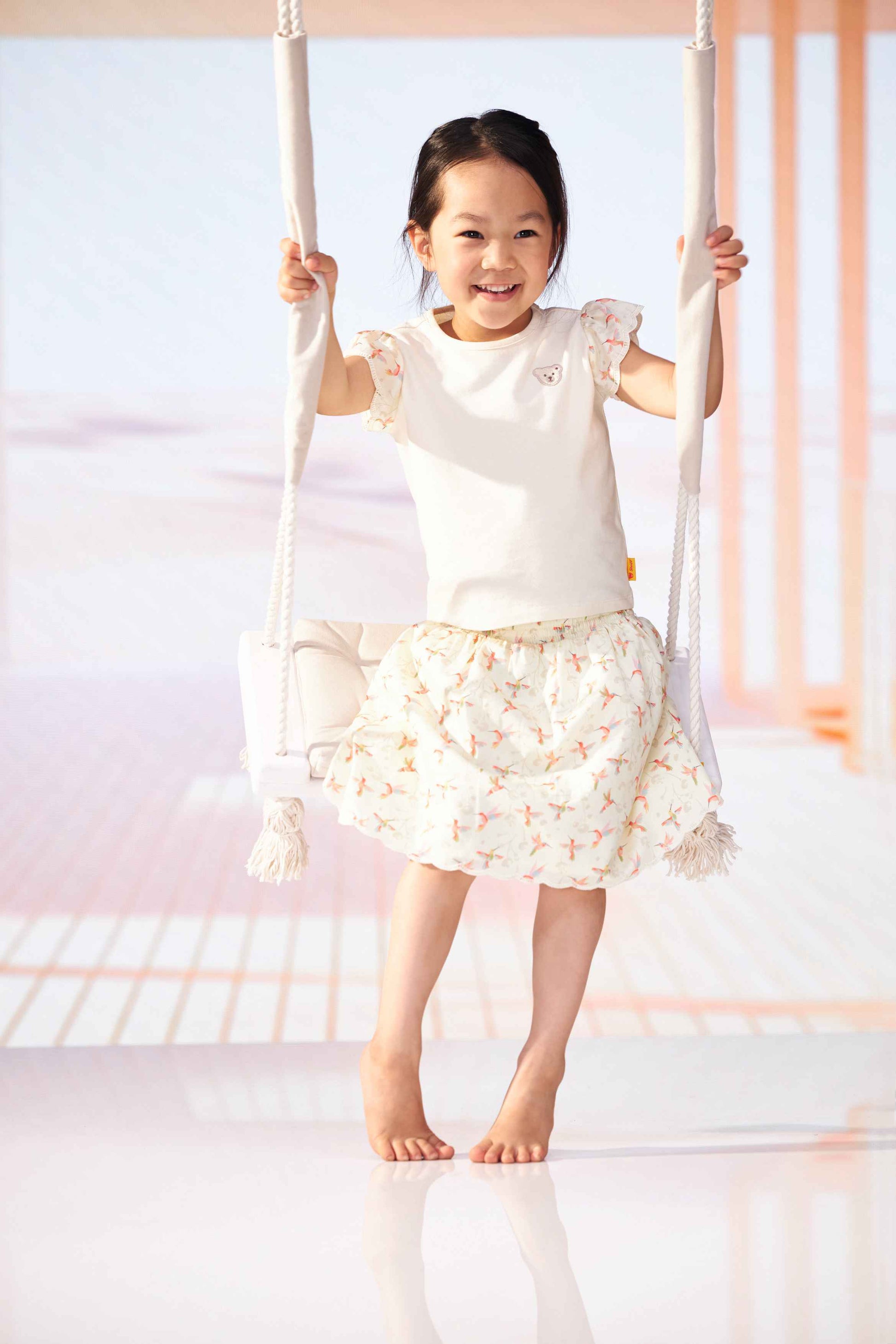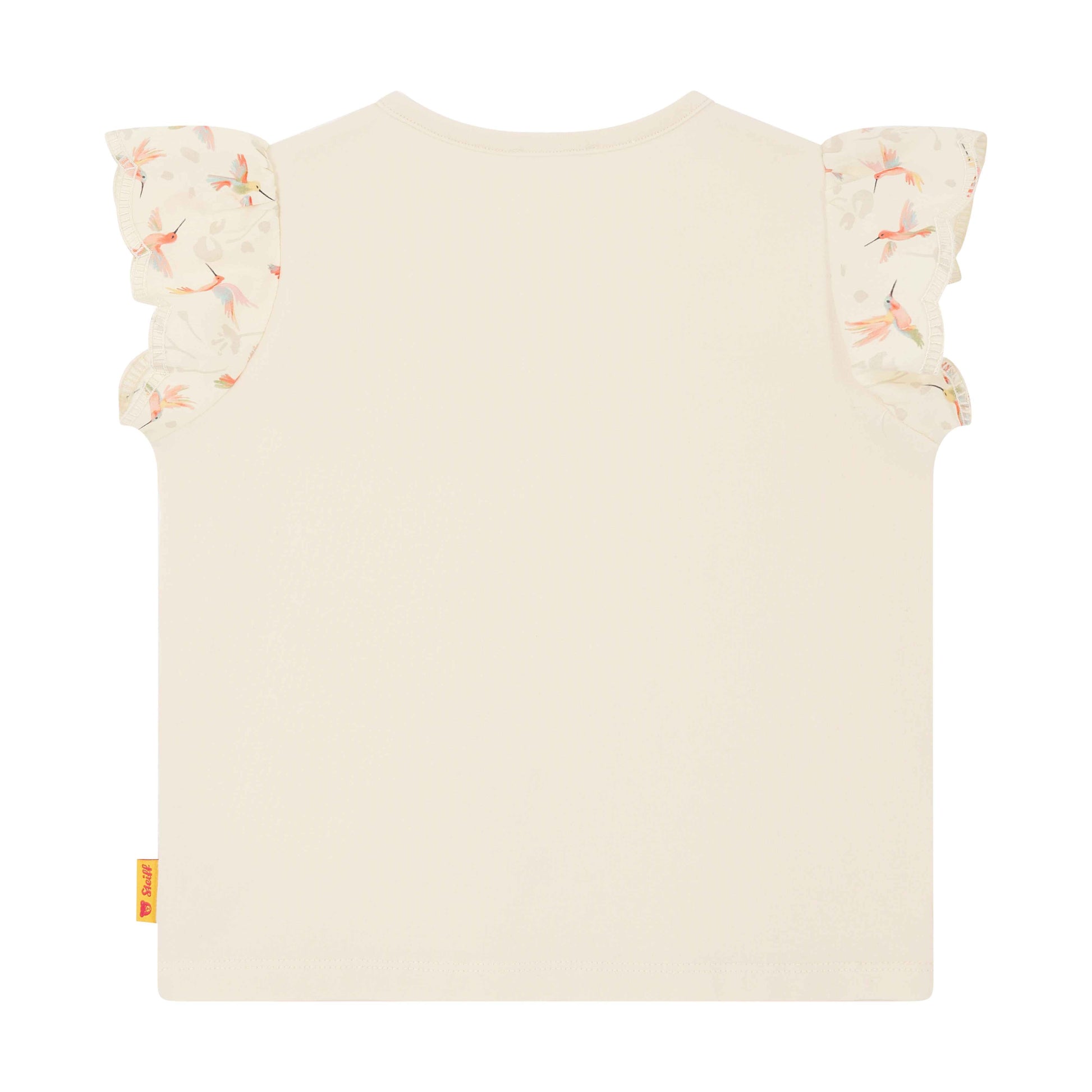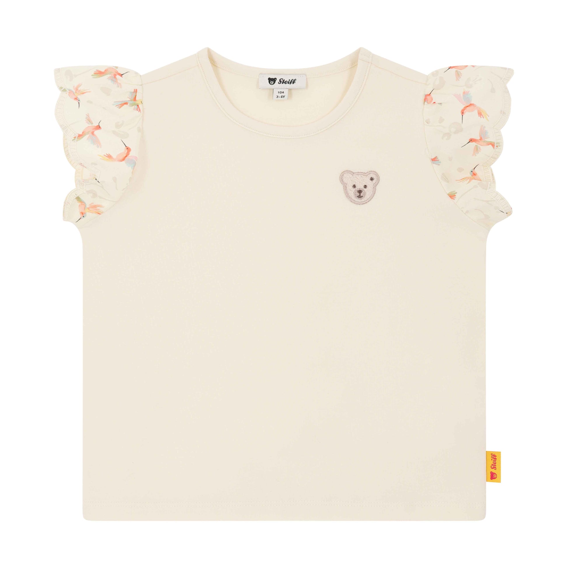 Dieses T-Shirt in sanftem Beige ist ein zauberhaftes Basic für kleine Entdeckerinnen. Das weiche Jersey sorgt für ein angenehmes Tragegefühl, während die ausgestellten Ärmel aus gewebter Baumwolle mit hübschem Kolibri-Print einen fröhlichen Akzent setzen. Die wellenförmige Stickerei am Ärmelsaum verleiht dem Oberteil eine liebevolle Note. Abgerundet wird der Look durch das flauschige Steiff Teddybärmotiv, das Vertrauen und Charme ausstrahlt. Ein wunderschönes Lieblingsstück für jeden Tag voller Abenteuer!