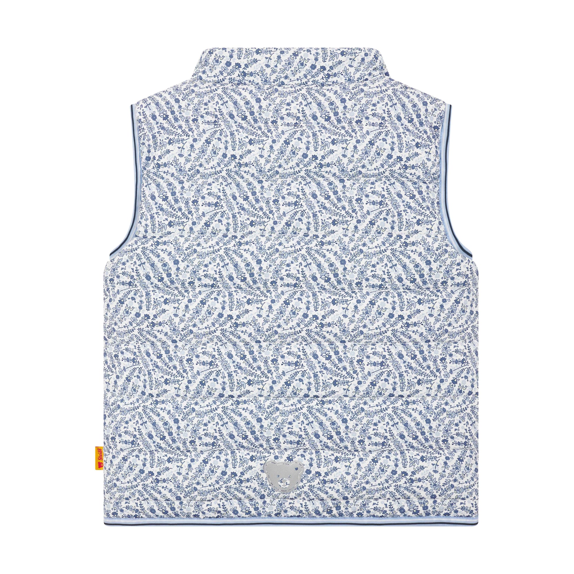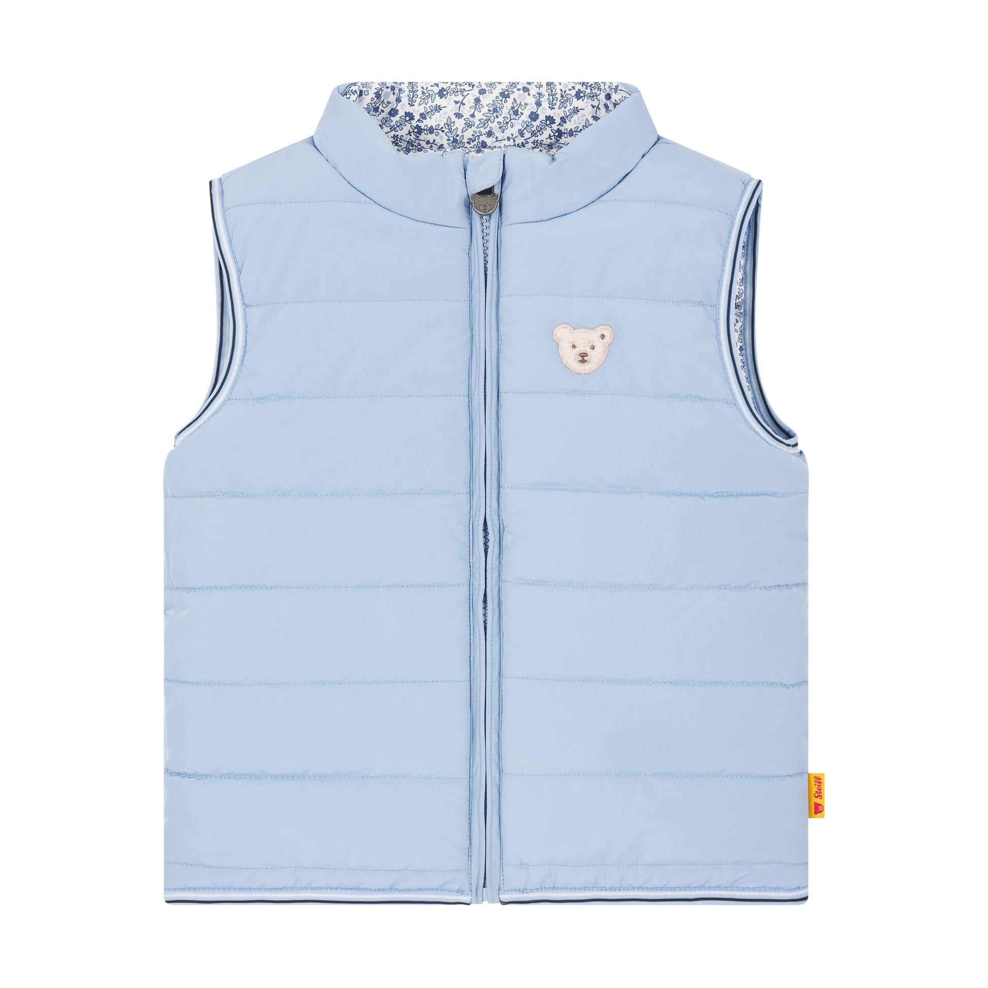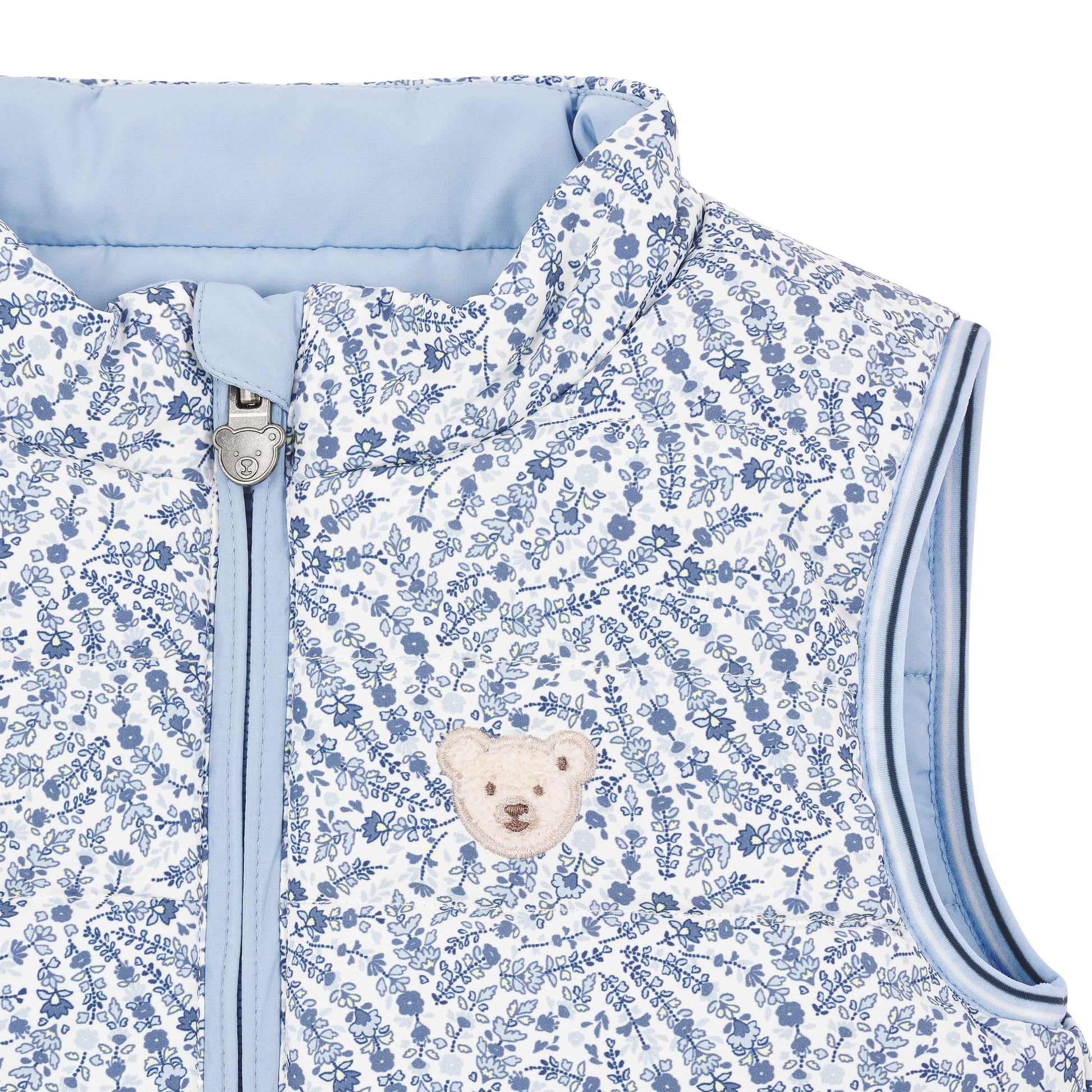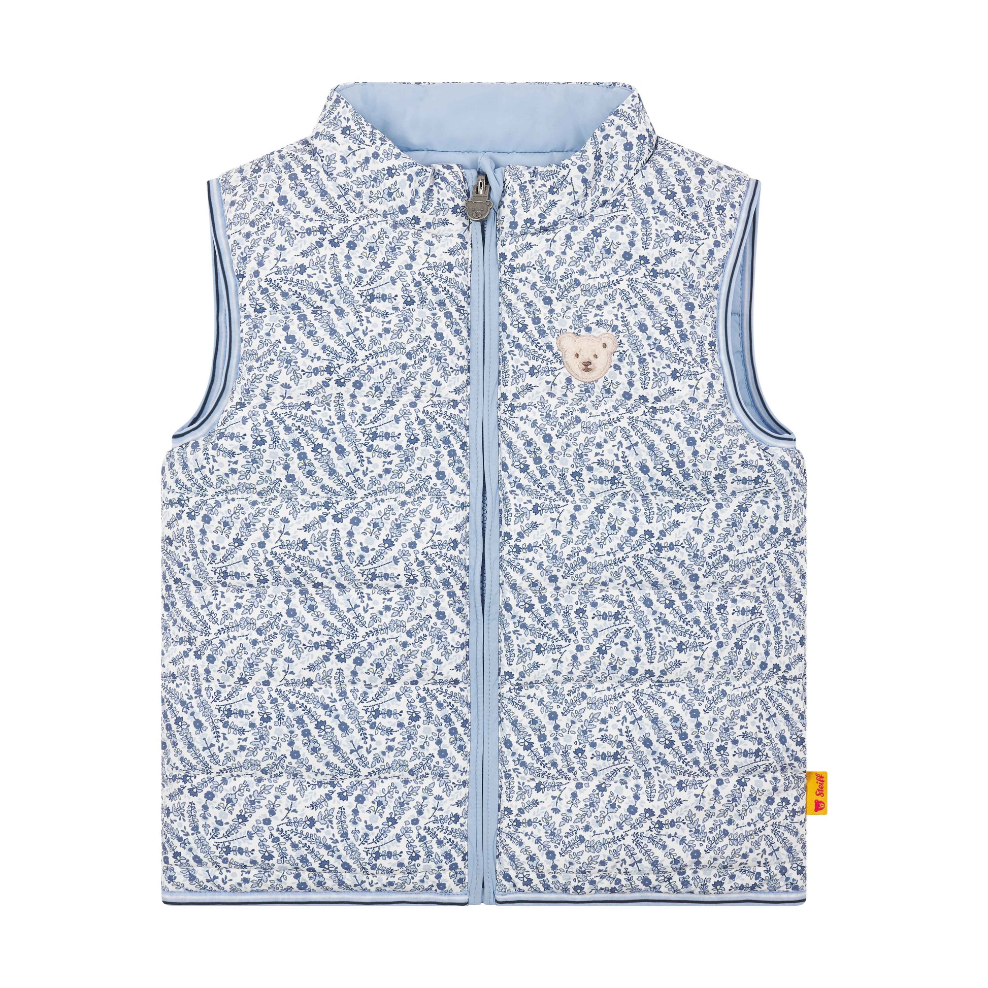 Diese wendbare Weste bringt Abwechslung und Komfort in den Alltag kleiner Stilikonen. Mit einer Seite in fröhlichem Blumenmuster und der anderen in schlichtem Hellblau lässt sie sich nach Lust und Laune stylen. Das wattierte, gesteppte Material mit atmungsaktivem, wasserabweisendem BIONIC-FINISH®ECO Imprägnierung schützt ideal bei wechselhaftem Wetter. Der gemütliche Stehkragen und zwei praktische Eingriffstaschen sorgen für extra Wohlfühlkomfort. Ein Reißverschluss mit Teddybär-Detail und Kinnschutz macht das Anziehen spielend leicht. Abgerundet durch das niedliche Steiff Teddybärmotiv wird die Weste zum Lieblingsstück für jeden Tag voller Abenteuer.