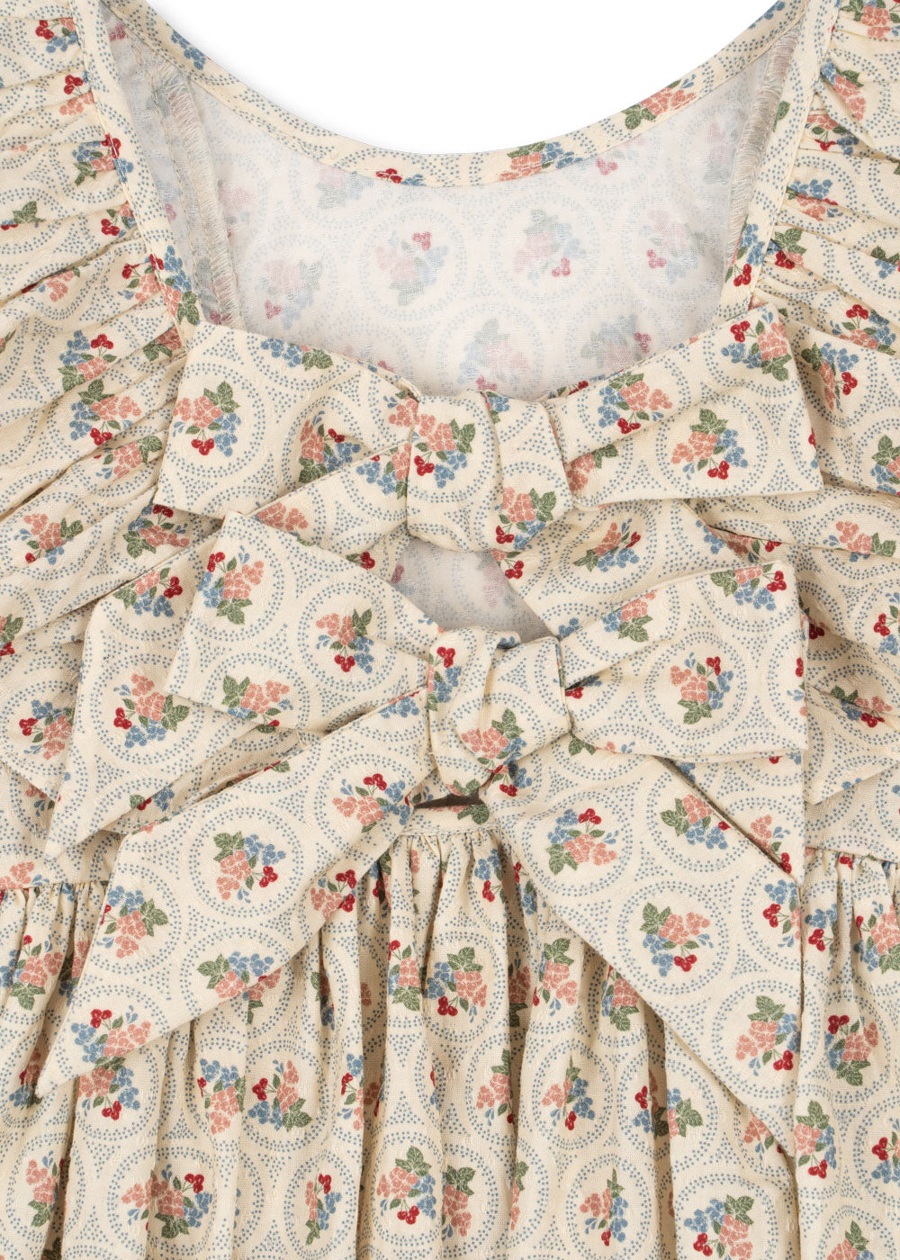 Ein Traumkleid voller verspielter Details: Dieses zarte Kleid von Konges Sløjd bezaubert mit seinem romantischen Blumenprint und den hübschen Rüschen auf der Vorderseite. Das besondere Highlight zeigt sich jedoch hinten – dort schmücken gleich zwei große Schleifen den Rücken und machen das Kleid zu einem echten Hingucker.