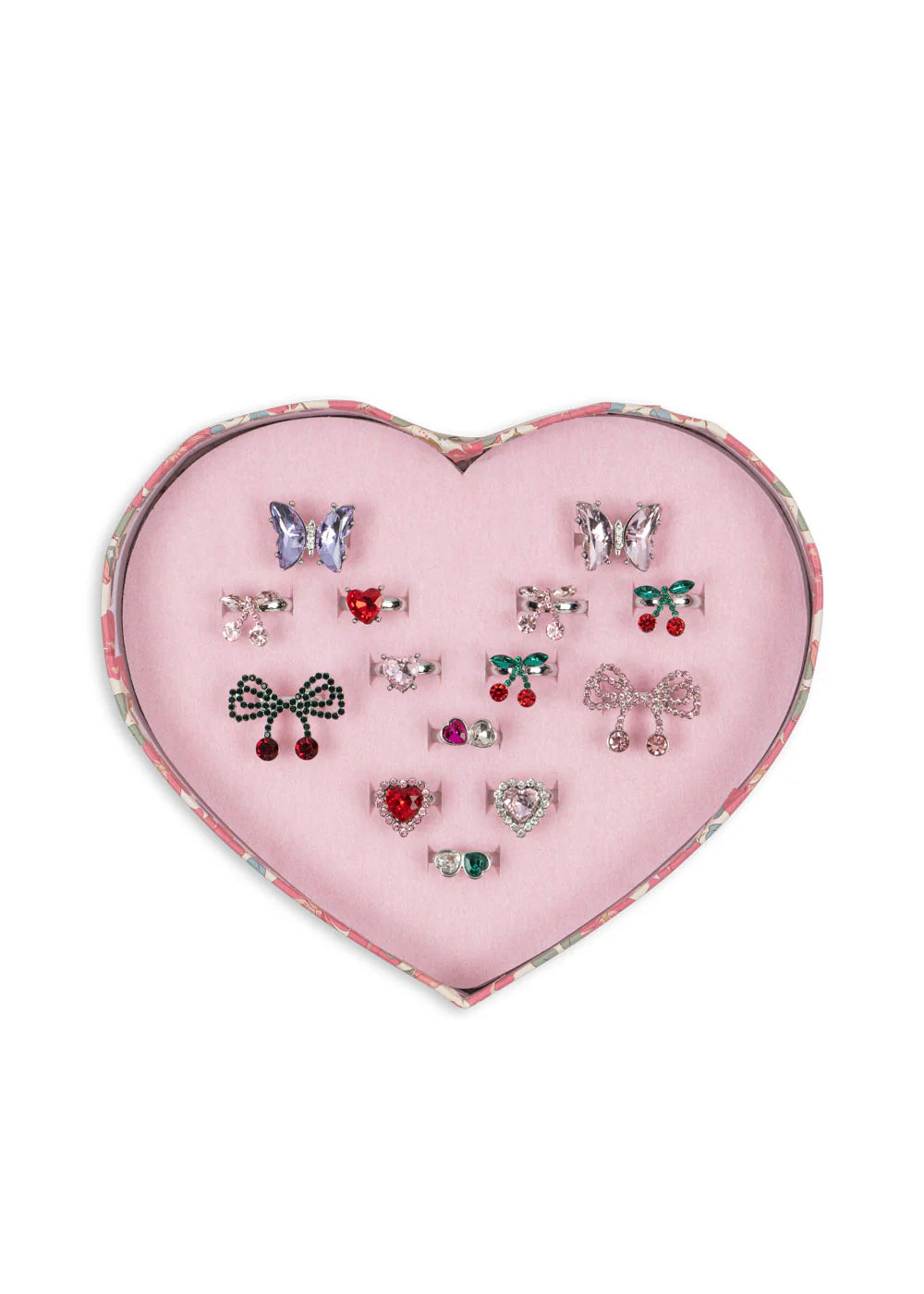 Dieses zauberhafte Ring-Set begeistert kleine Schmuckfans mit einer liebevoll gestalteten Auswahl an 14 funkelnden Ringen. Präsentiert in einer herzförmigen Box mit farbenfrohem Blütenmuster und einer zarten rosa Schleife, sorgen verspielte Designs wie Schmetterlinge, Herzen, Schleifen und Kirschen für leuchtende Augen.