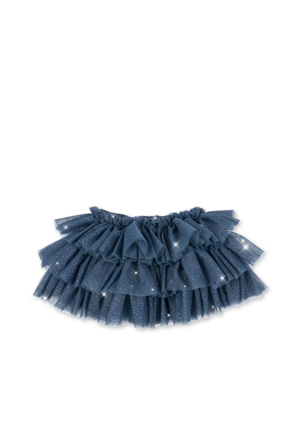 Dieser traumhafte Tüllrock in edlem Nachtblau glitzert wie ein Sternenhimmel und sorgt für einen zauberhaften Auftritt – ob beim Tanzen, Verkleiden oder einfach im Alltag. Die weich fallenden Tüllschichten verleihen dem Rock ein wunderschönes Volumen, während das Futter aus 100 % Bio-Baumwolle für ein angenehmes Tragegefühl sorgt.