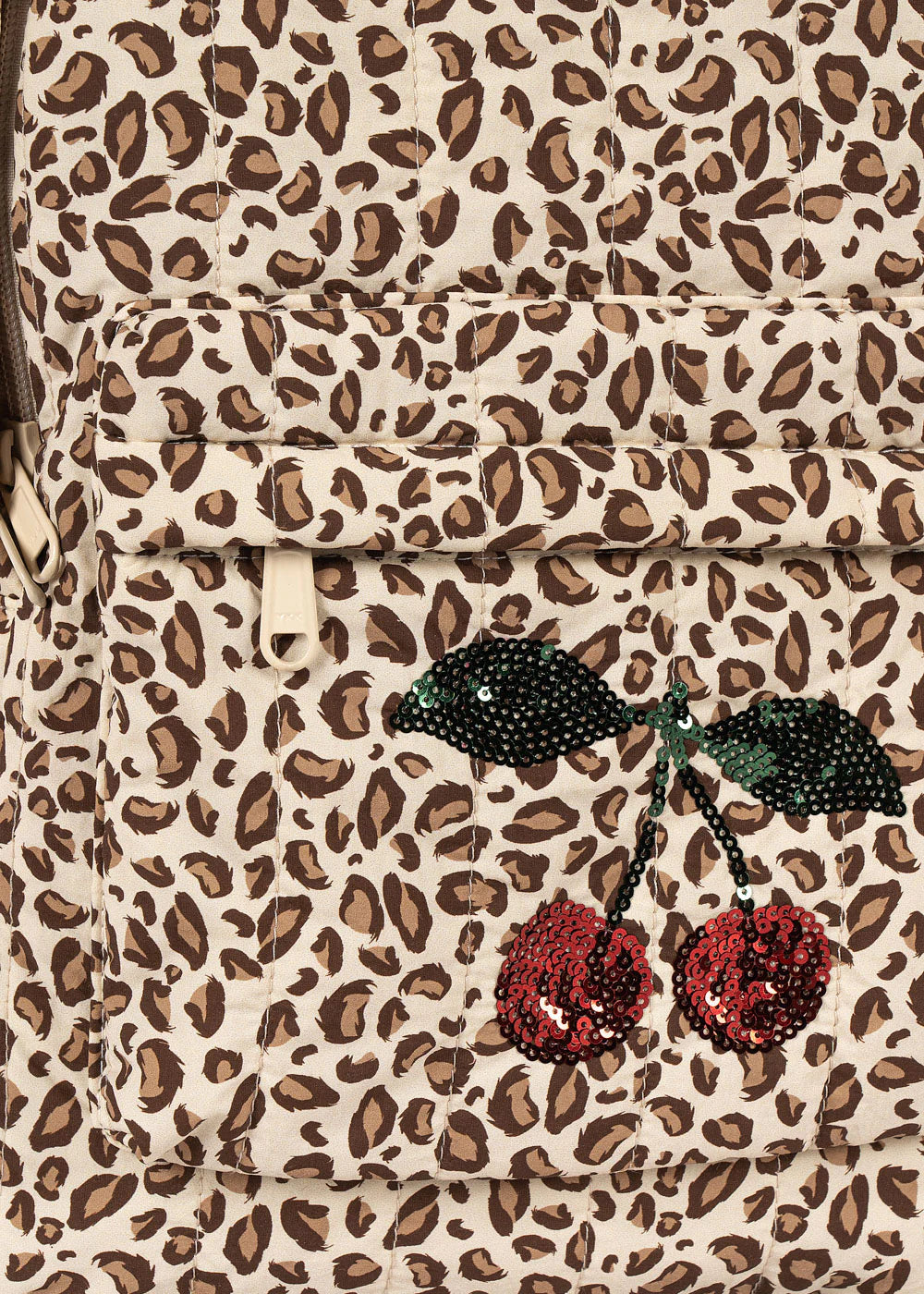 Der weiche, gesteppte Stoff sorgt für eine angenehme Haptik und einen tollen Tragekomfort. Das verspielte Leopard-Muster trifft auf eine funkelnde Pailletten-Kirschen-Stickerei – ein besonderes Detail, das Kinderaugen strahlen lässt ✨🍒