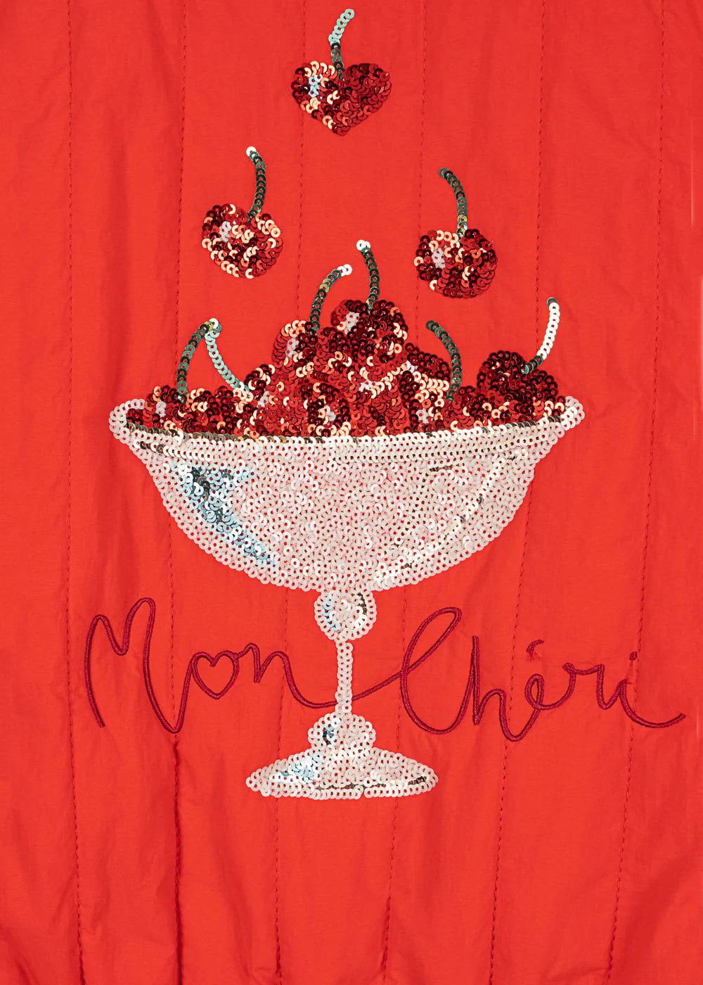 Das besondere Detail: Die liebevoll gestaltete „Mon Chéri“ Paillettenstickerei auf Rücken und Front – ein funkelnder Hingucker, der jedes Outfit zum Lieblingslook macht 🍒✨