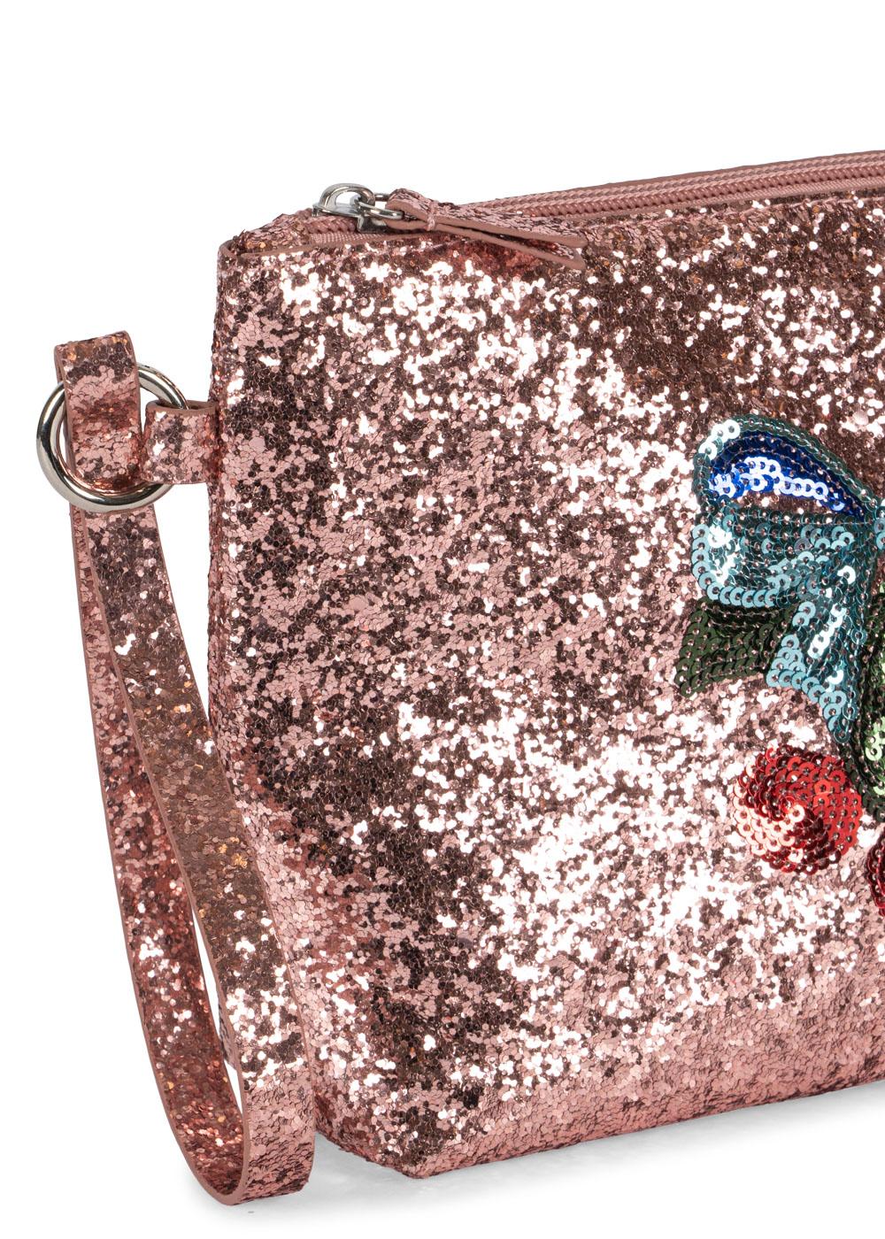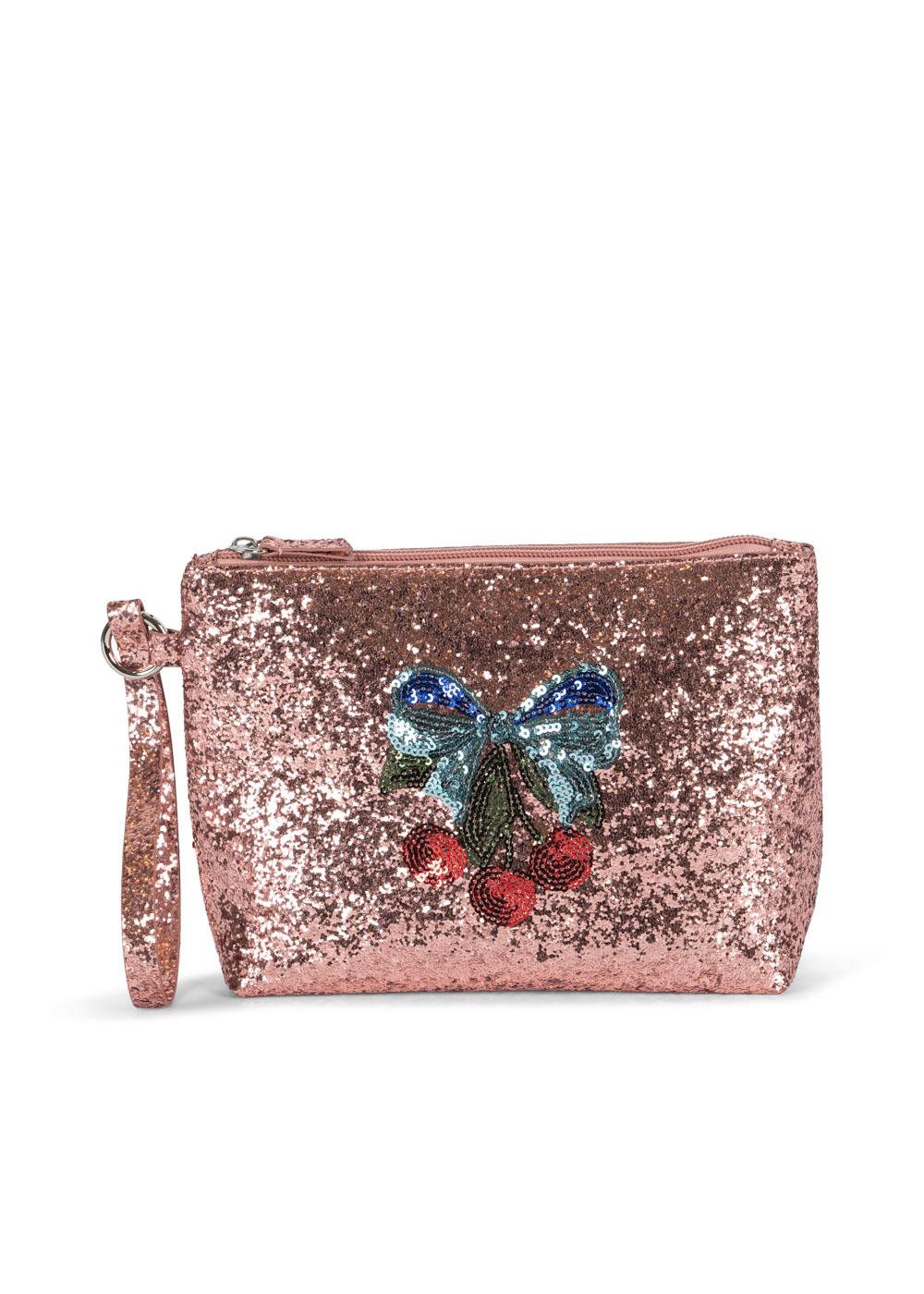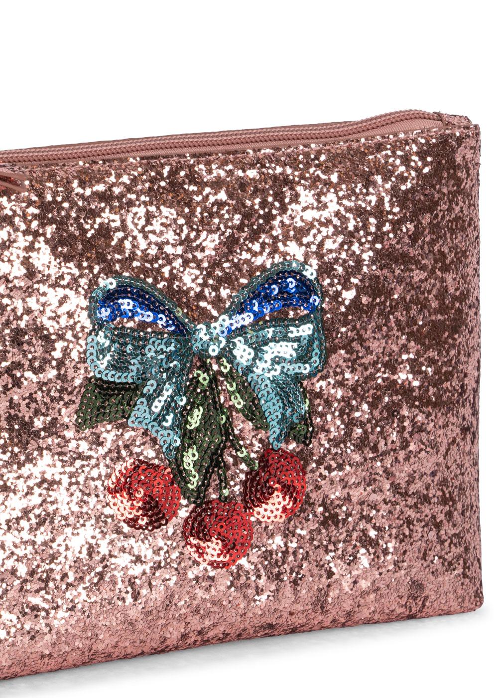 ✨ Ein Glitzertraum zum Mitnehmen! Dieses funkelnde Täschchen ist wie gemacht für kleine Styling-Queens, die sich gerne schmücken, frisieren und spielen. Die glitzernde Kulturtasche in Roségold bezaubert mit einer schimmernden Pailletten-Schleife samt Kirschen – ein echtes Highlight für kleine Fashion-Herzen 🍒🦋