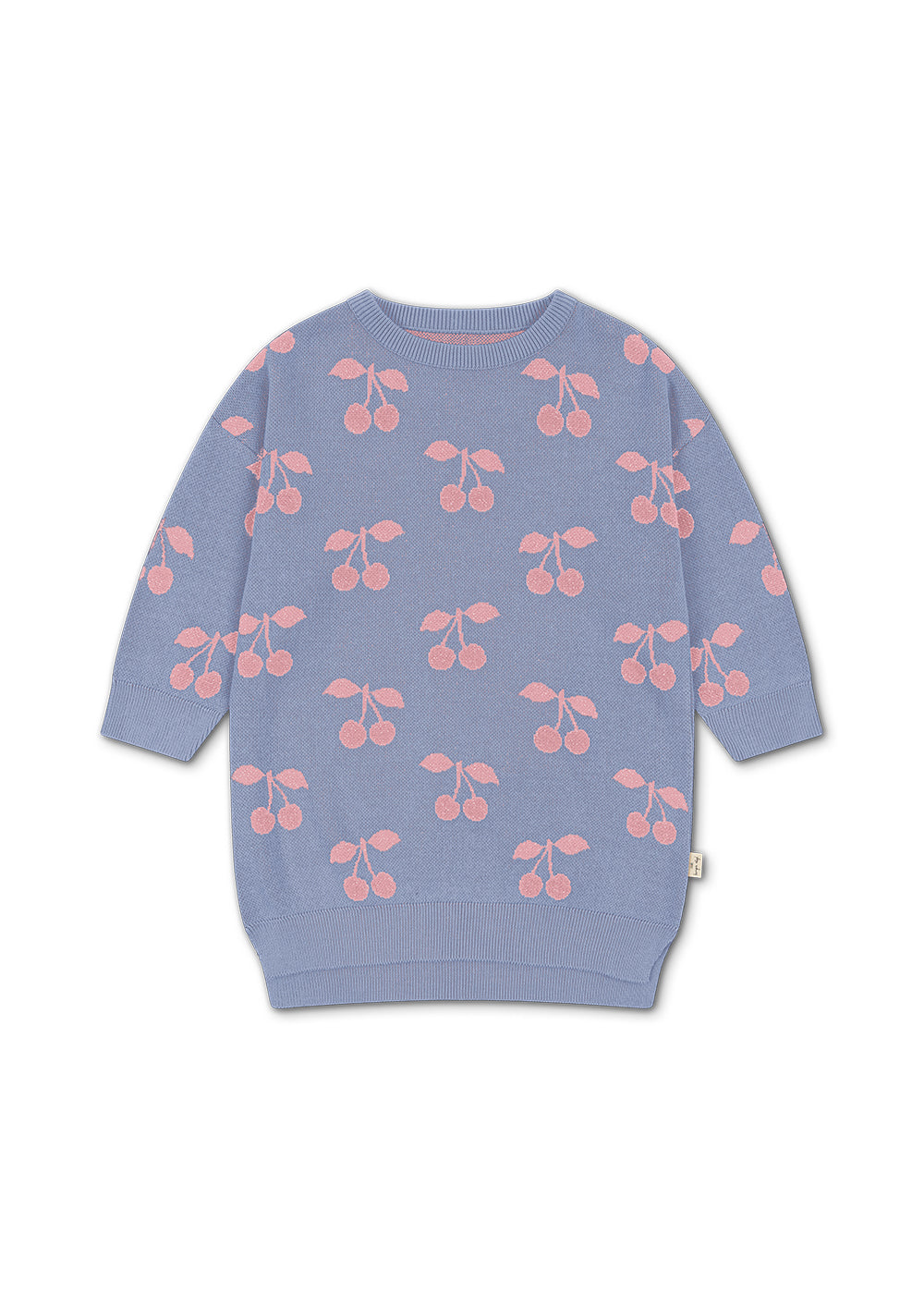 Das verspielte Kirschmuster auf zartem Blau macht das Kleid zu einem besonderen Lieblingsstück – ideal für fröhliche Tage und besondere Momente.