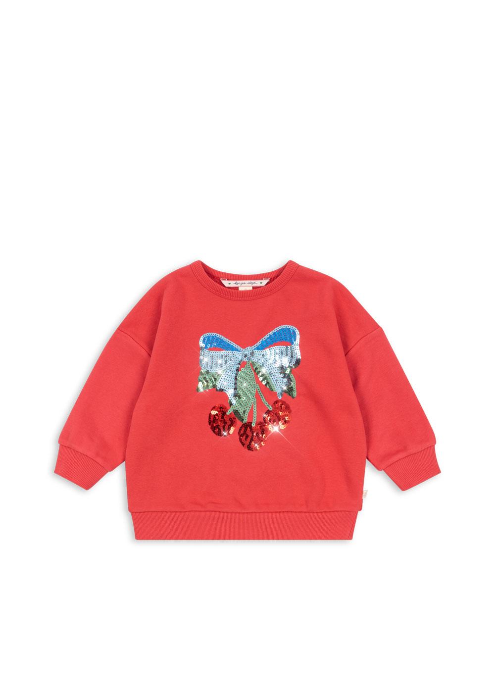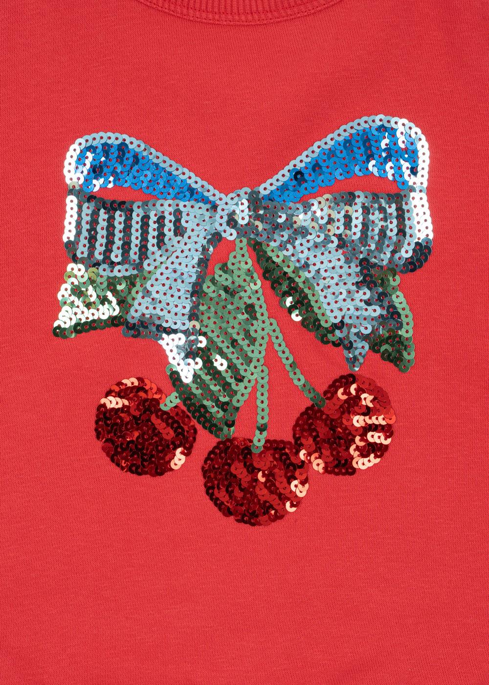 Dieses leuchtend rote Sweatshirt ist ein echter Hingucker und bringt Farbe in jede Kinder-Garderobe. Im Mittelpunkt steht eine aufwendig gestaltete Pailletten-Stickerei mit einer glänzenden Schleife, grünen Blättern und drei glitzernden Kirschen – ein verspieltes Motiv, das sofort ins Auge fällt und bei kleinen Fashion-Fans garantiert gut ankommt.