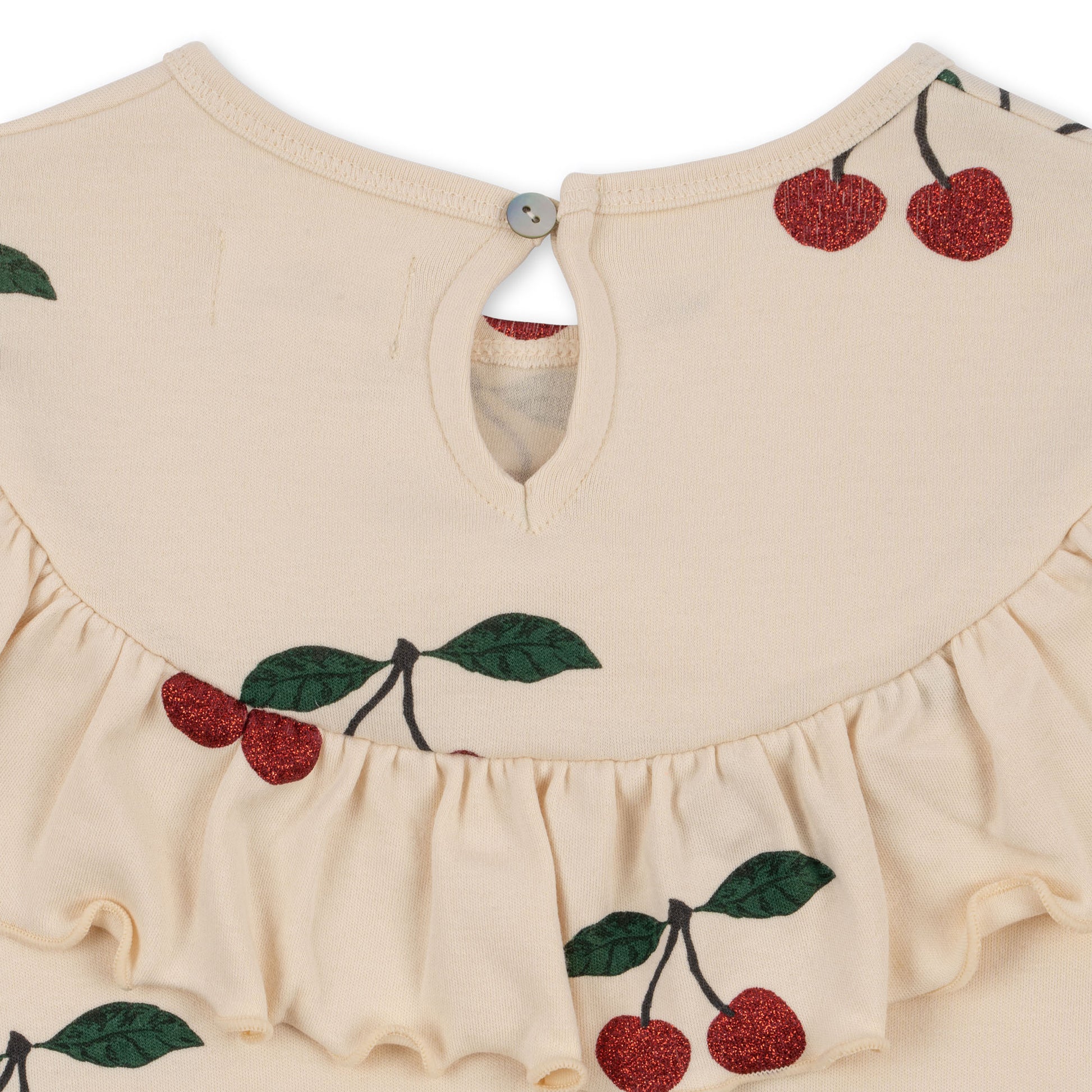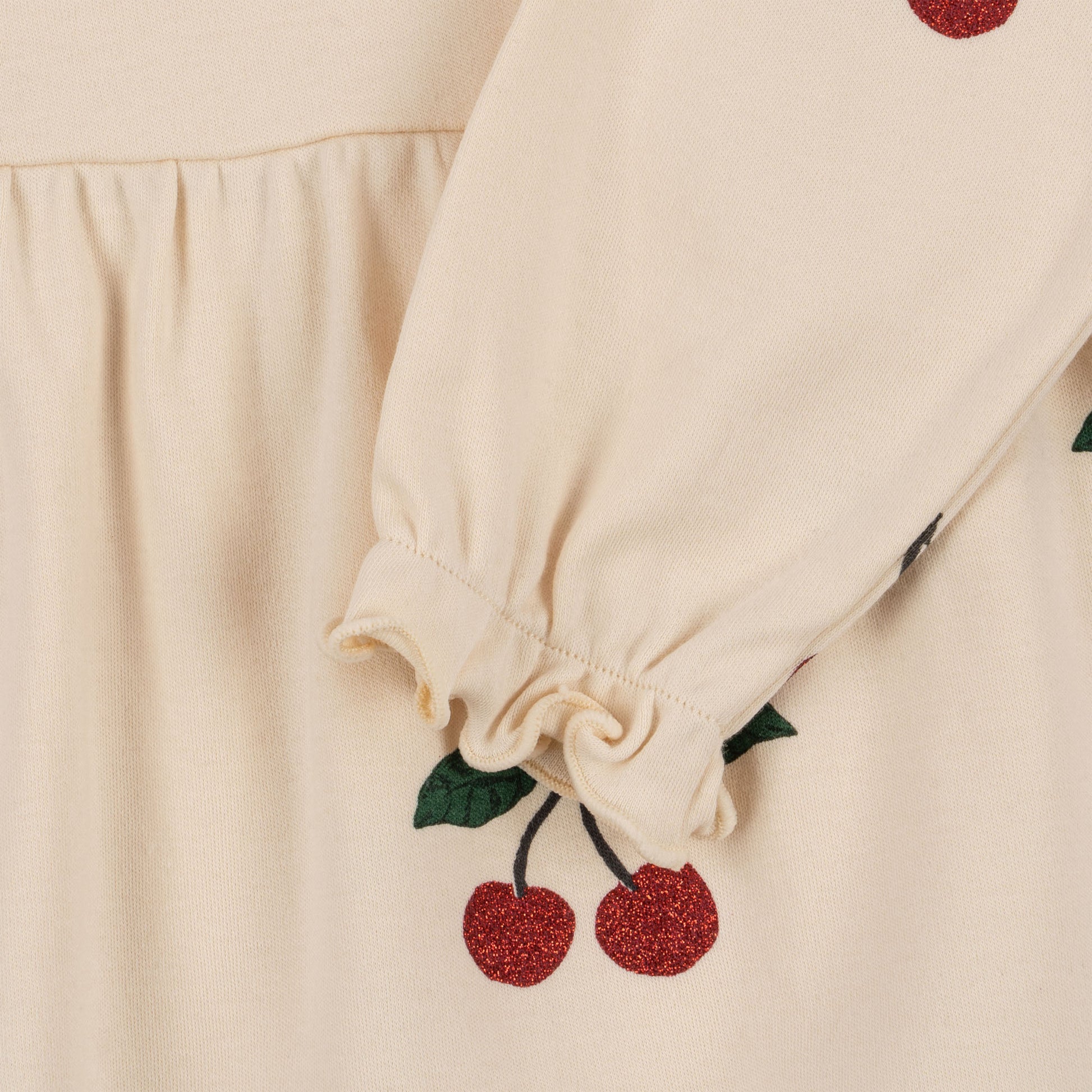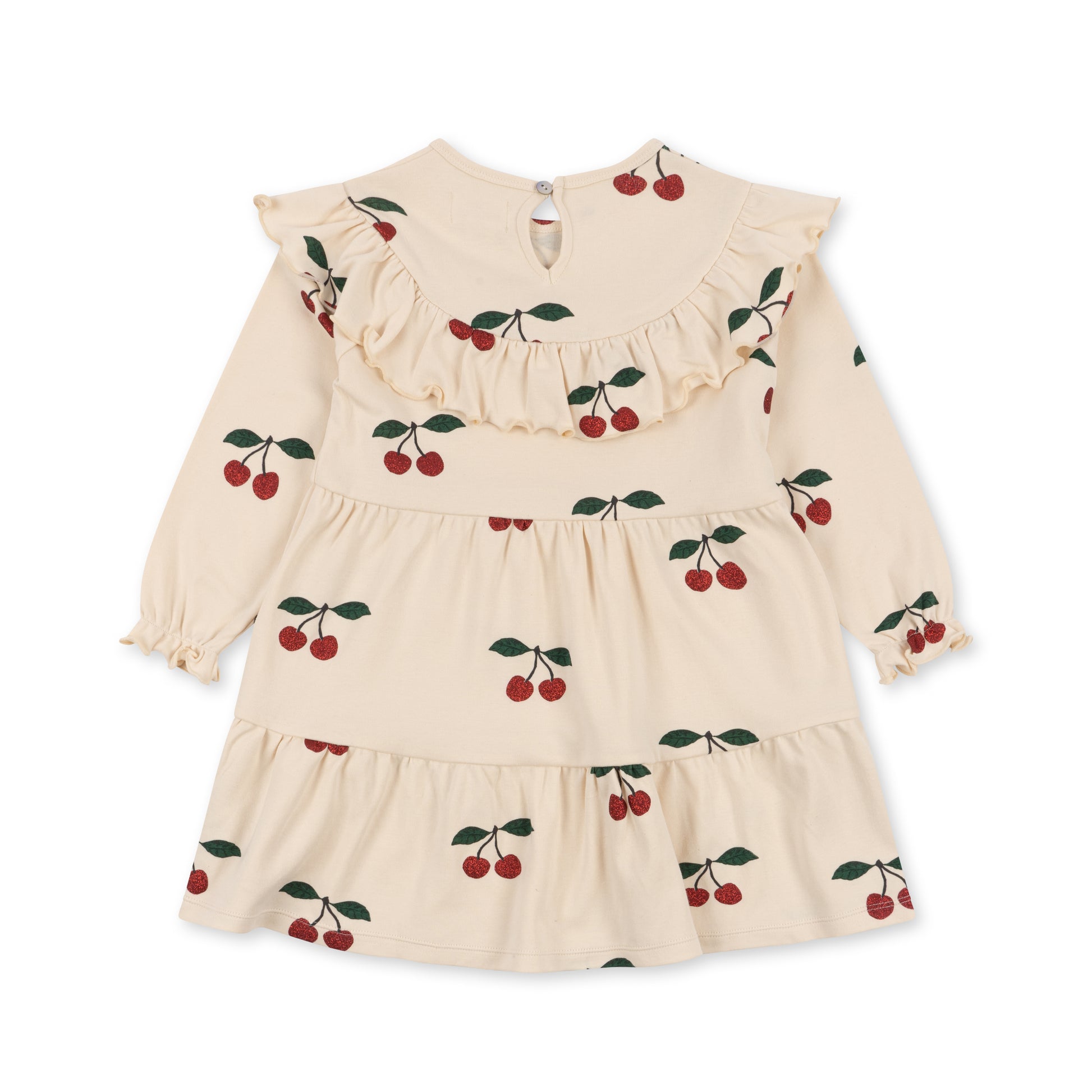 Ein liebevoll gestaltetes Kleid aus weicher Bio-Baumwolle mit glitzernden Kirsch-Prints und charmanten Volantdetails. Der ausgestellte, stufige Rock verleiht dem Kleid eine verspielte Silhouette, die bei jeder Bewegung mitschwingt.