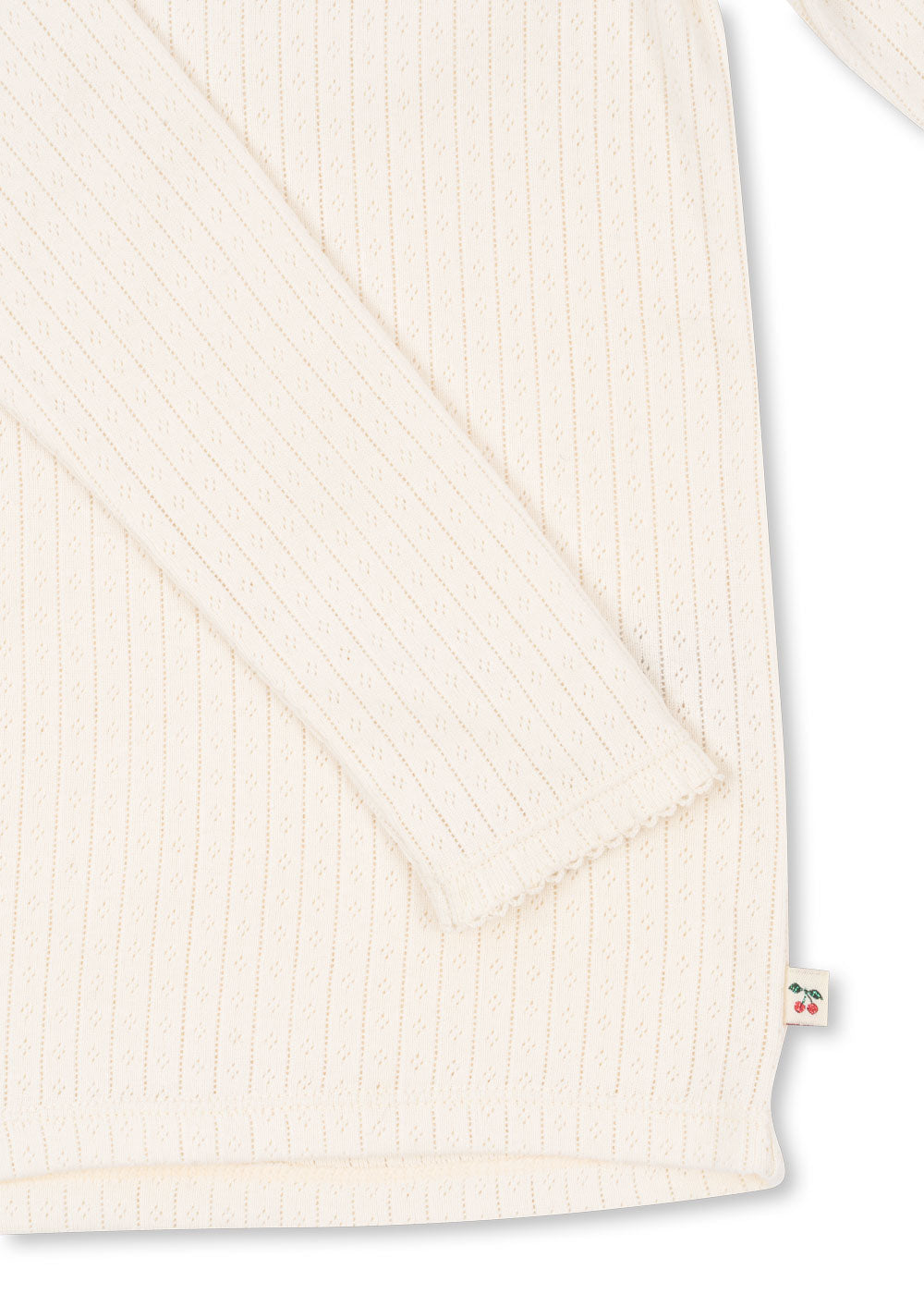 Ein zartes Langarmshirt aus angenehm weicher Bio-Baumwolle – perfekt als bequeme Basisschicht im Alltag. Das feine Ajour-Muster und die dekorative Spitzenkante am Halsausschnitt verleihen dem schlichten Design eine liebevolle Note.