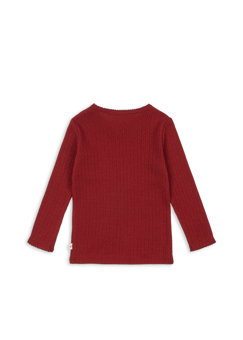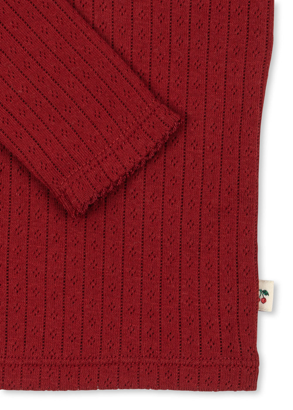 Dieses Longsleeve in sattem Rot bringt sofort Wärme und Festlichkeit in den Alltag. ❤️ Das feine Ajour-Muster verleiht ihm eine besondere Struktur, während die kleine Schleife am Halsausschnitt einen süßen Akzent setzt.