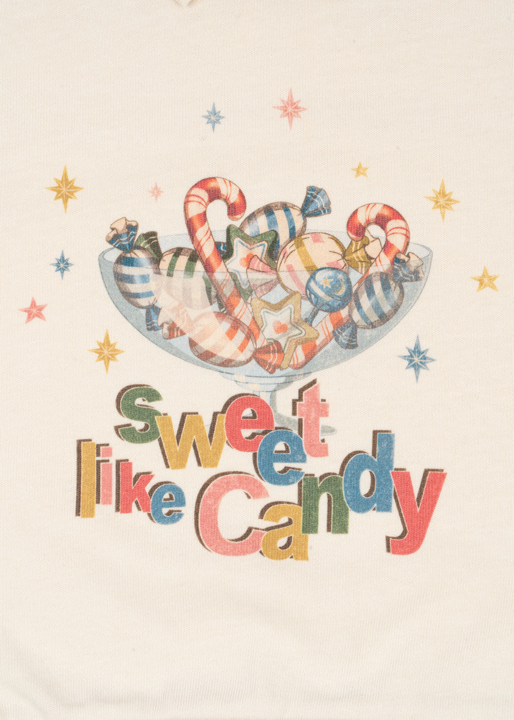 So süß wie Zuckerwatte 🍭✨ – dieser Polosweater bringt gute Laune in jeden Tag. Auf dem weichen Creme-Ton strahlt der bunte Print „Sweet like Candy“ mit Schüssel voller Bonbons, Zuckerstangen und Sternchen – fast wie aus einem Kindertraum. Der kleine Kragen rundet das verspielte Design mit einem Hauch von Klassik ab.