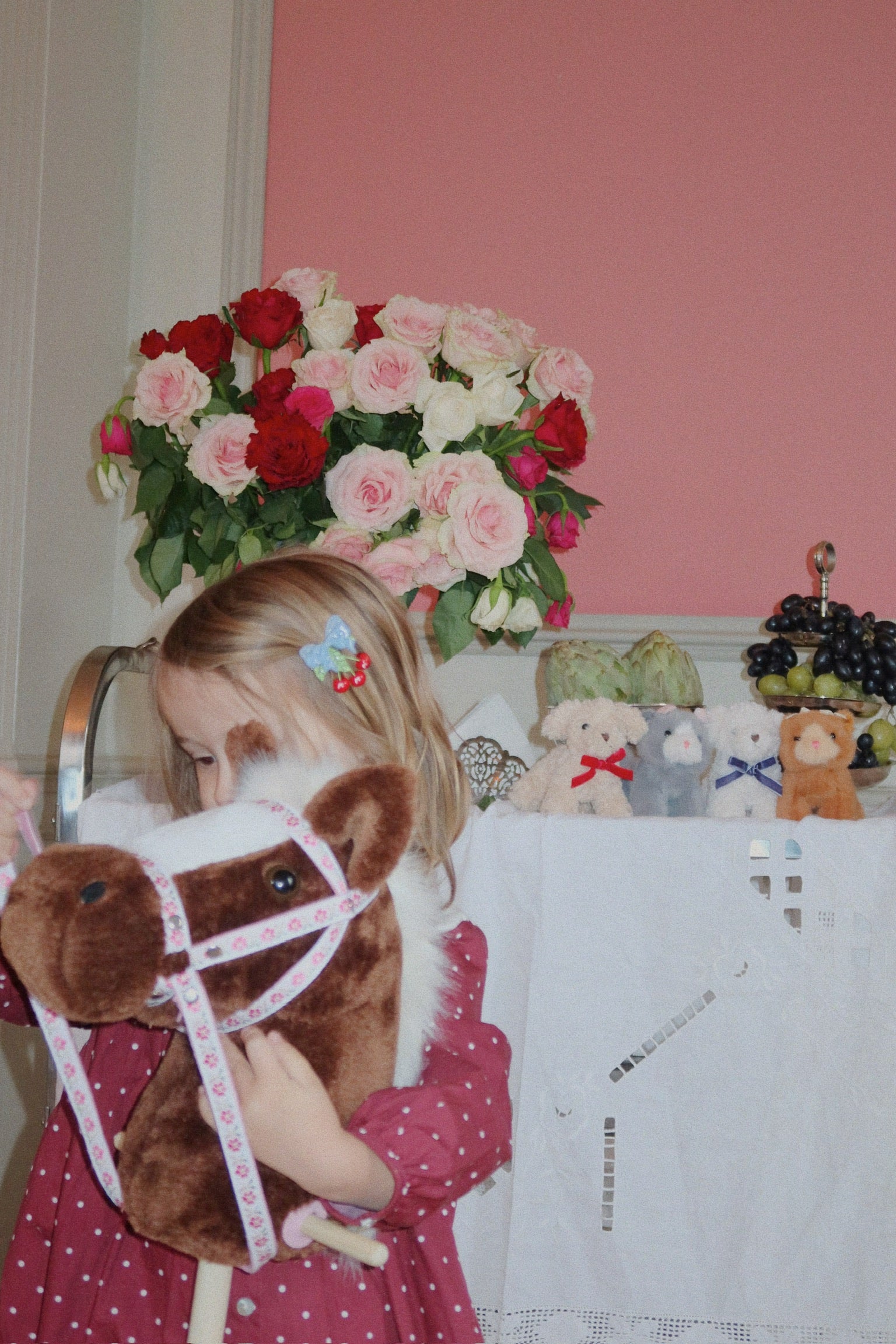 Dieses wunderschöne Steckenpferd lässt Kinderherzen höher schlagen! Mit seinem kuschelweichen Fell, der weißen Mähne und der detailreichen Trense im Blumenmuster lädt es zu fantasievollen Reitabenteuern ein.