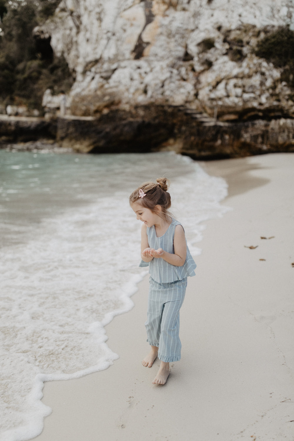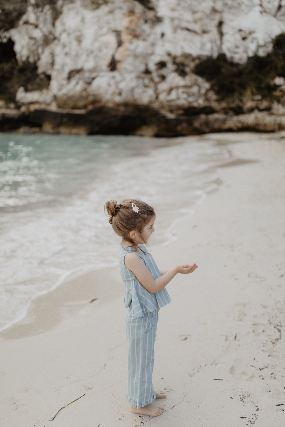 Der weite Schnitt schenkt viel Bewegungsfreiheit, während der elastische Bund individuell angepasst werden kann und das An- und Ausziehen kinderleicht macht. Der zarte Rüschensaum verleiht der Hose eine verspielte Note. Besonders schön: Es gibt auch das passende Top für ein harmonisches Set 🤍