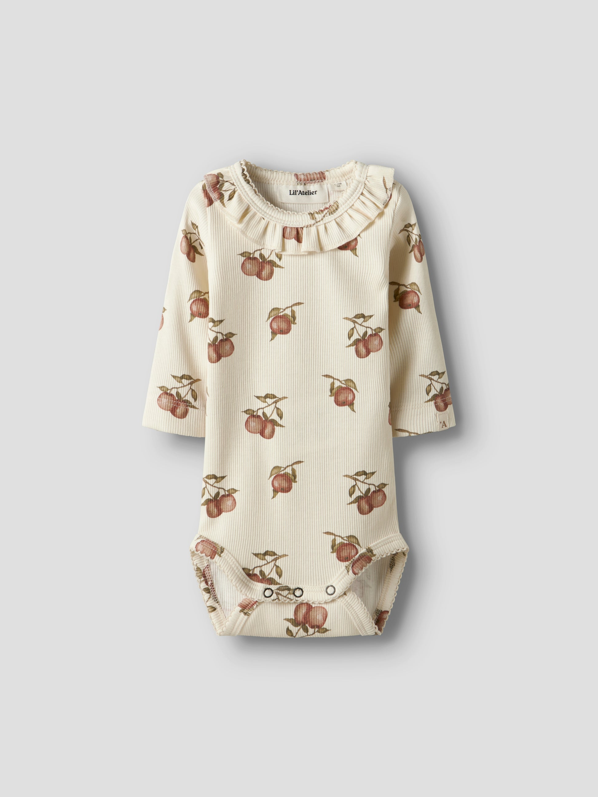 Das Highlight ist das liebevolle Früchte-Muster in gedämpften Rot- und Brauntönen, das dem Body einen charmanten Vintage-Touch verleiht 🍐🍎. Ein wunderschönes Detail ist der zierliche Rüschenkragen am Ausschnitt, der das Design noch eleganter und niedlicher wirken lässt 💕.