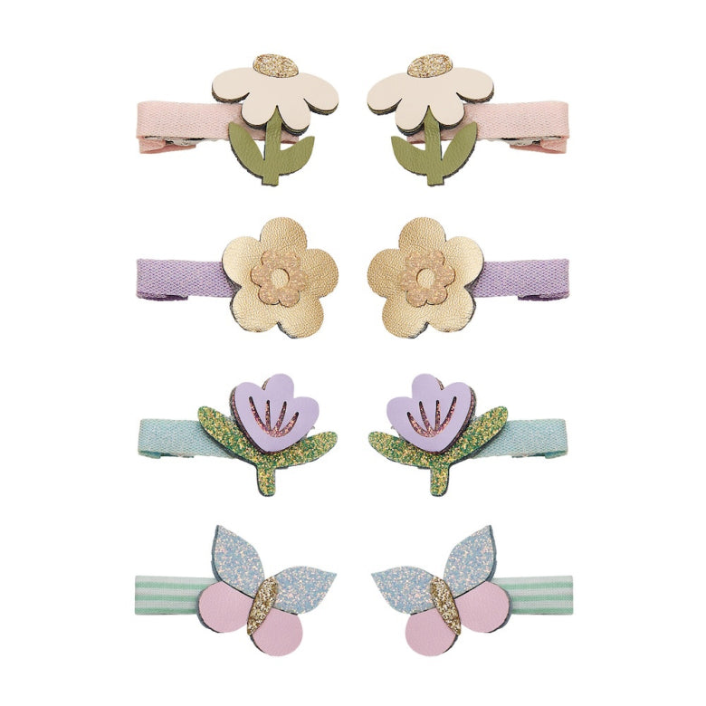 Zarte Blütenformen, ein süßer Schmetterling und sanfte Pastell- sowie Naturtöne mit feinem Glanz machen jede Frisur einfach herzig.