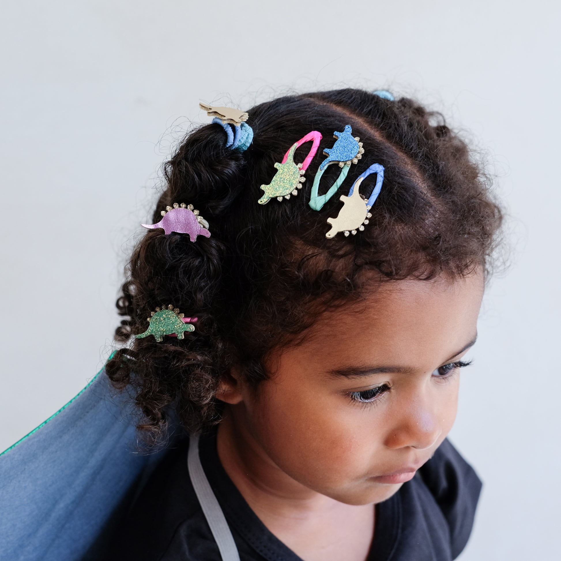 Diese sechs farbenfrohen Zopfgummis bringen echten Dino-Spaß ins Haar! Jeder Haargummi ist mit einem niedlichen kleinen Stegosaurus verziert – mal in Glitzergrün, mal in Gold oder Lila – und sorgt für fröhliche Farbtupfer und ganz viel gute Laune 🦖✨