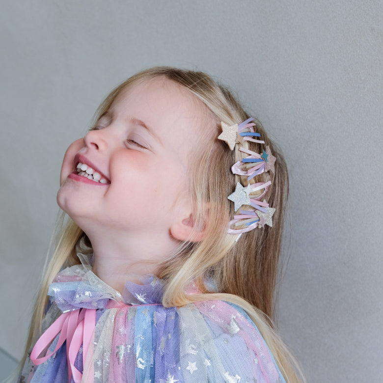 Ein Umhang wie aus einem Märchen ✨🌈 – zarter Tüll in sanften Regenbogenfarben, verziert mit funkelnden Sternchen und kleinen, glitzernden Einhörnern 🦄, die wie magische Begleiter über den Stoff tanzen. Mit der hübschen Schleife zum Binden und zwei glitzernden Sternenanhängern wird er zum perfekten Accessoire für kleine Träumerinnen und Zauberer.