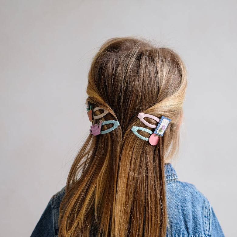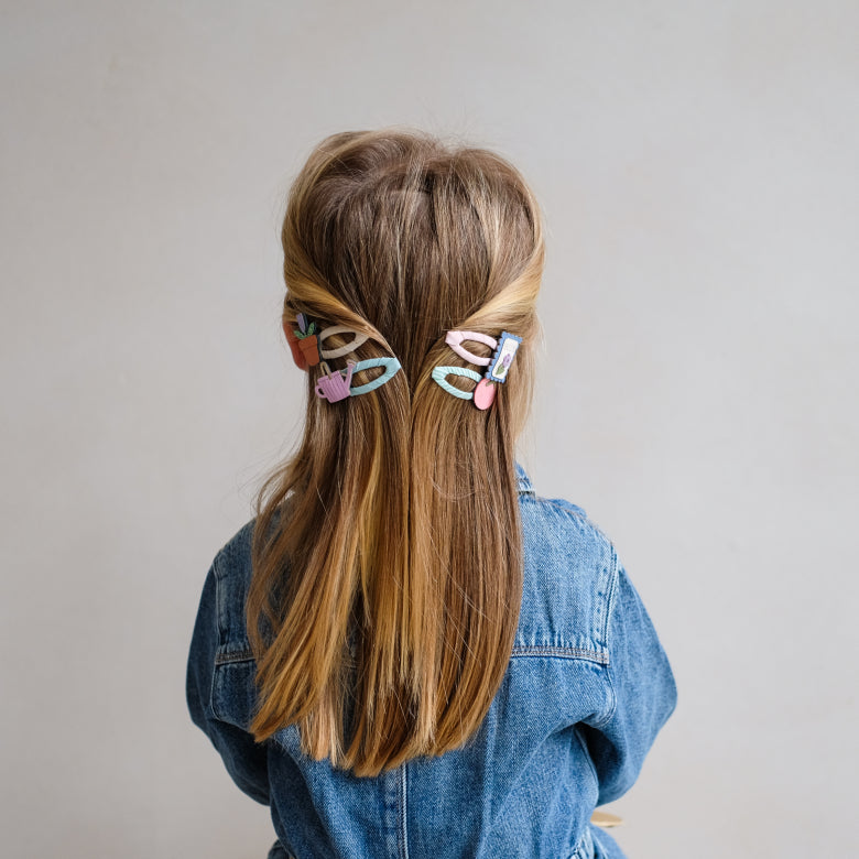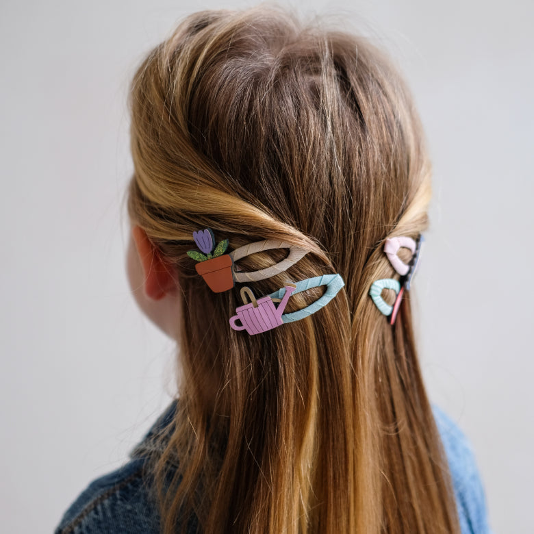 Gießkanne, Samenpäckchen, Blumentopf und saftige Tomate erzählen kleine Gartengeschichten und machen jede Frisur einfach herzig.