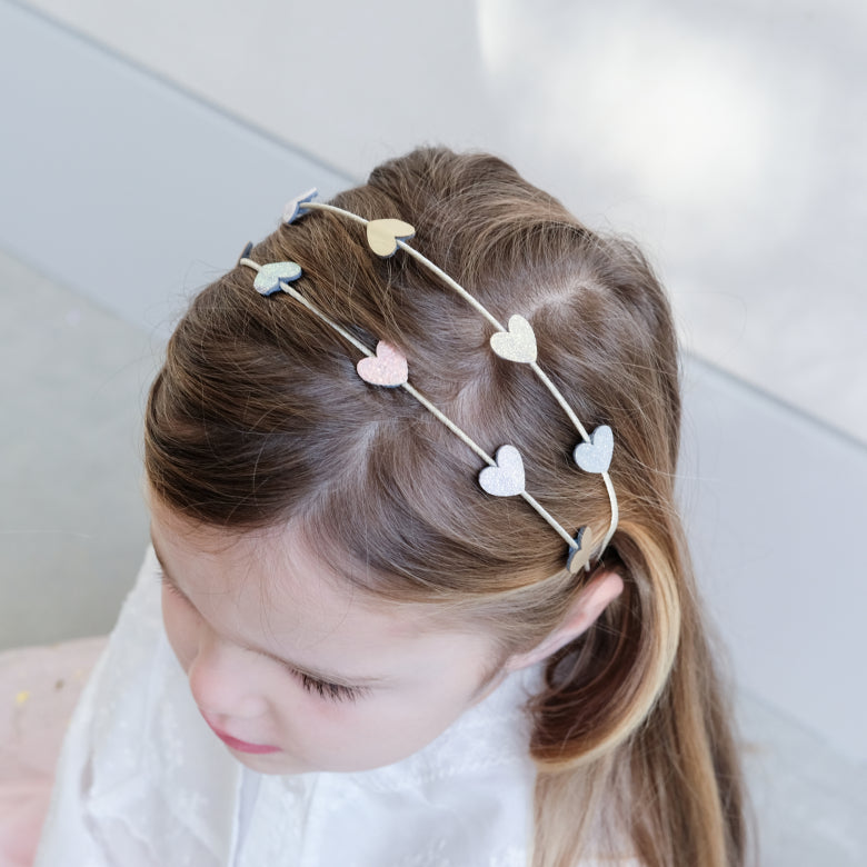 Feine, goldene Linien treffen auf kleine Herzen in sanften Glitzer- und Naturtönen und verleihen jeder Frisur eine ganz besondere Leichtigkeit.