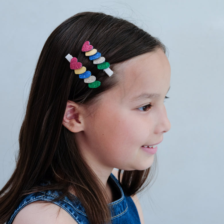Diese süßen Haarspangen lassen kleine Herzen höherschlagen! 💖 Jede Spange ist mit fünf glitzernden Herzchen in den schönsten Farben verziert – von kräftigem Rot über Gold und Blau bis hin zu Bronze und Grün. Ein kleines Regenbogenfest für jedes Kinderhaar! 🌈✨