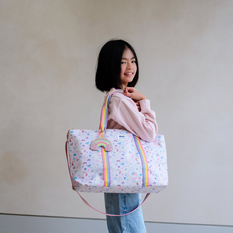 Diese zauberhafte Reisetasche macht jede Übernachtung noch ein bisschen magischer! Der traumhafte Einhorn-Print mit Schleifen, Sternschnuppen und Herzchen sorgt sofort für gute Laune und begleitet kleine Abenteurer perfekt zu Oma, zur Pyjamaparty oder in den Urlaub.