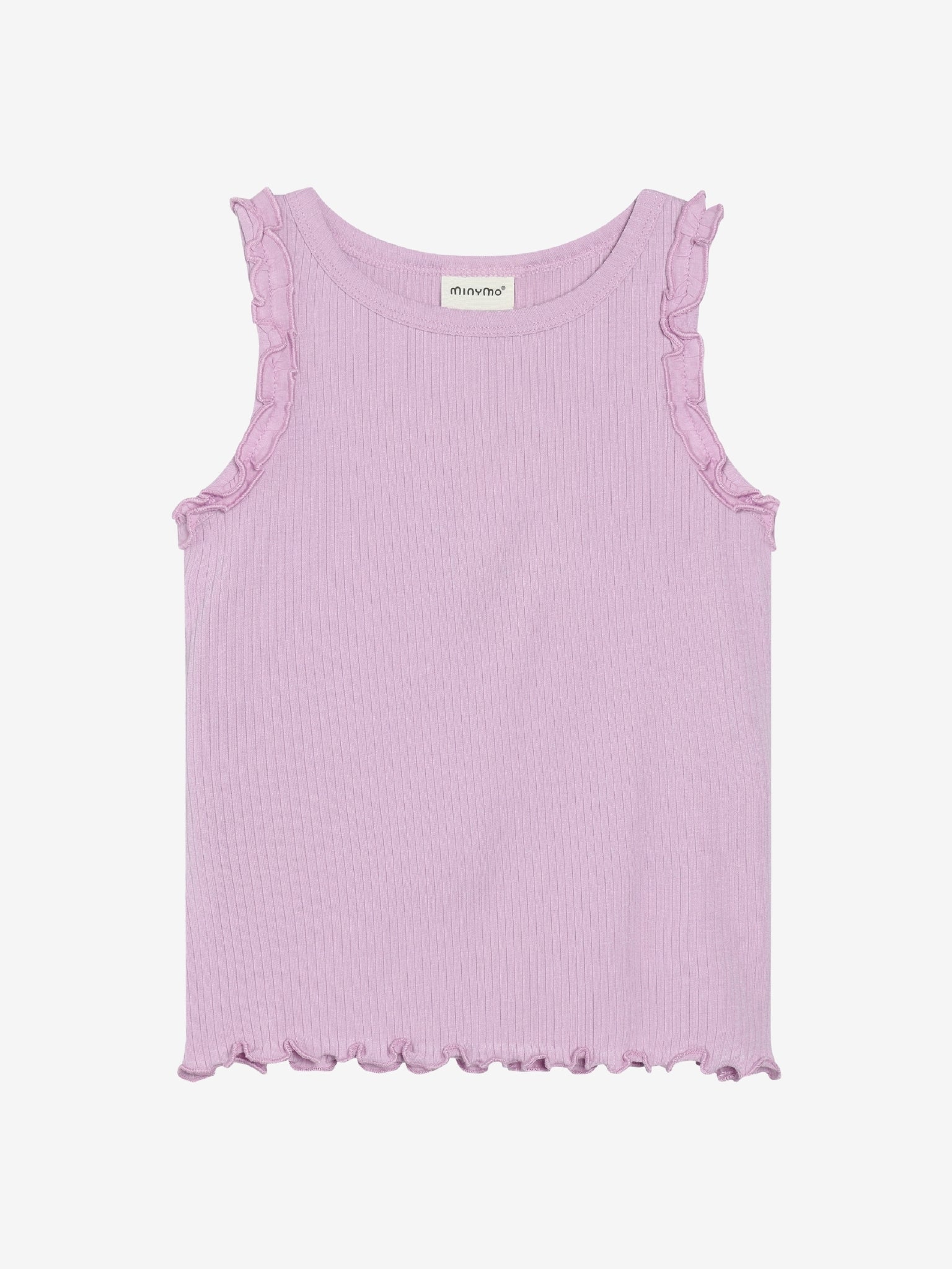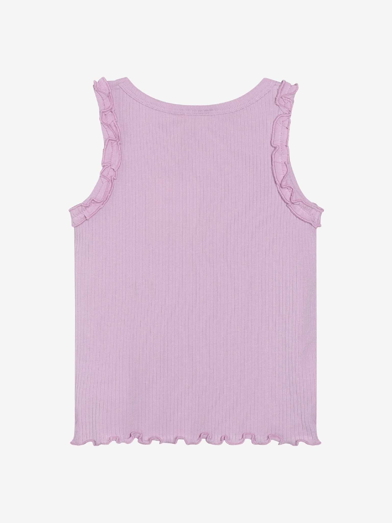 Die feine Rippstruktur sorgt für eine schöne Passform, während die zarten Rüschen an den Armausschnitten und der verspielte Abschluss am Saum dem Top eine liebevolle, mädchenhafte Note verleihen 🌸