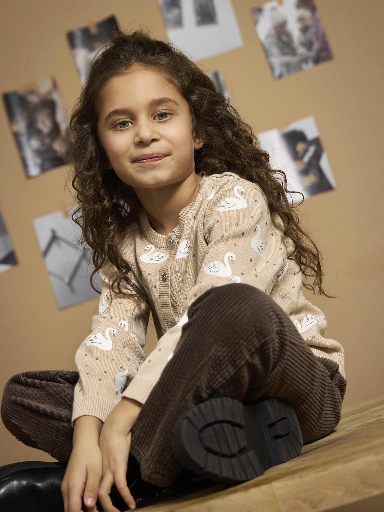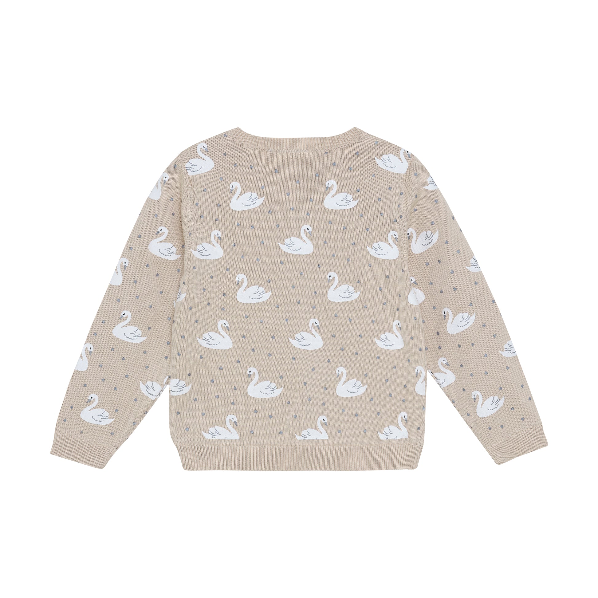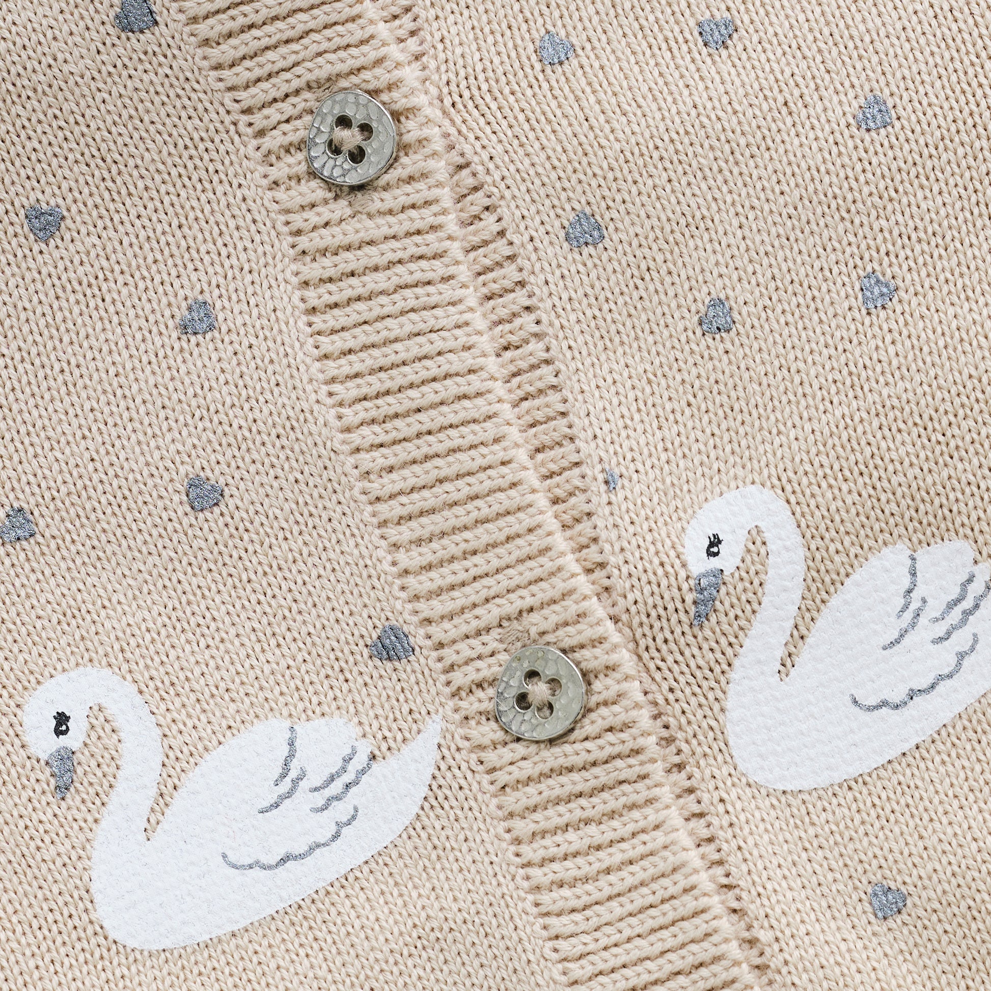 Zart, weich und einfach zauberhaft – diese Strickjacke aus 100 % Baumwolle ist ein echtes Lieblingsstück für kühlere Tage. Das sanfte Beige wird von kleinen Herzchen und anmutigen Schwänen geziert, die wie gemalt auf dem kuscheligen Maschenbild tanzen.