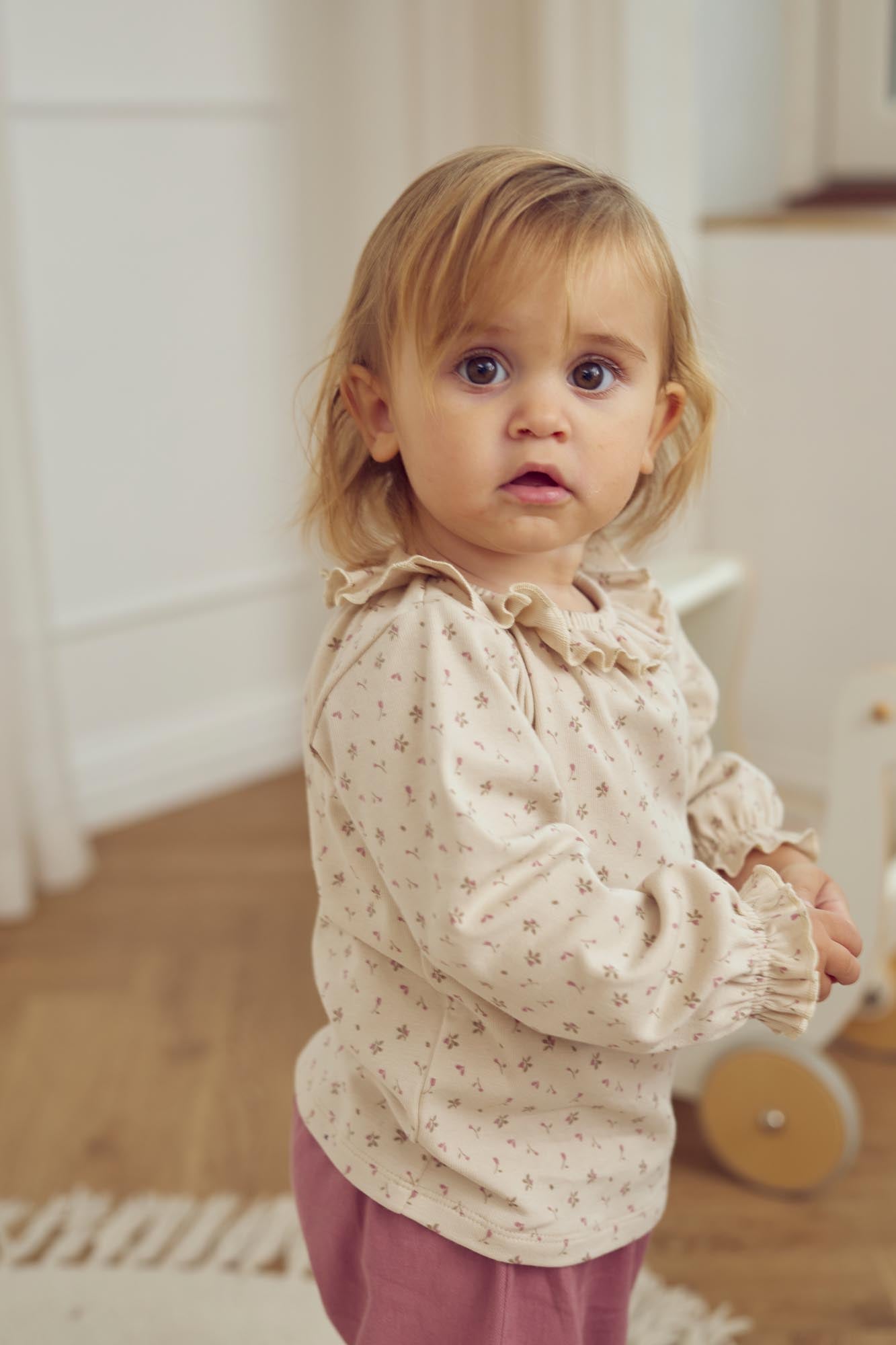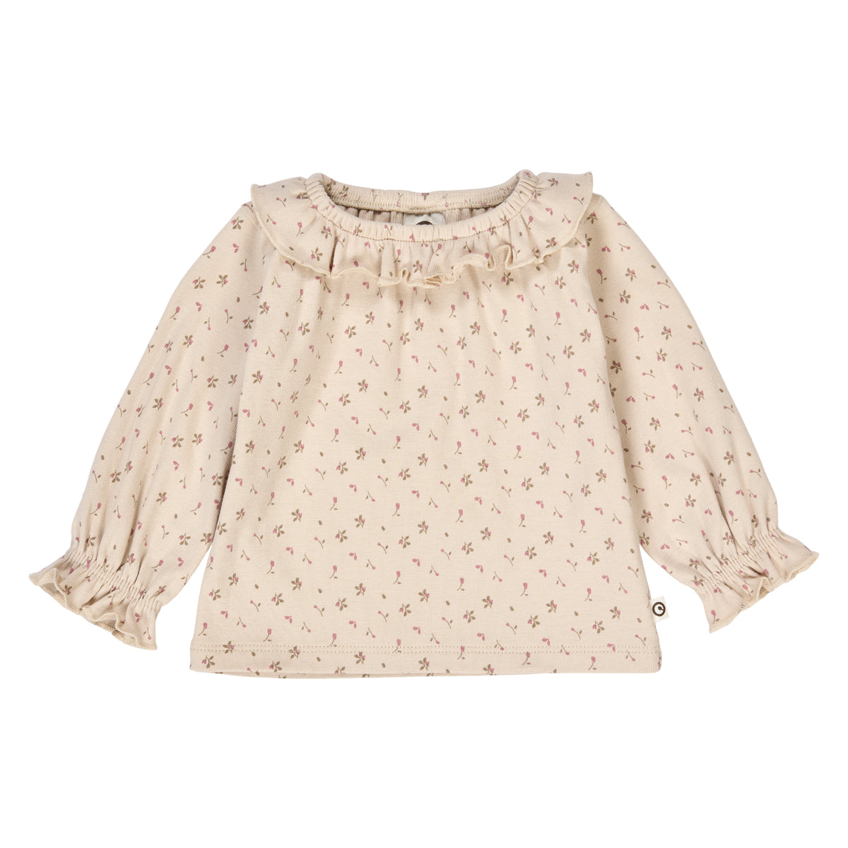 Dieses zart gemusterte Langarmshirt von Müsli besticht durch seine schlichte Eleganz und romantische Details. Die feinen Blümchen auf warmem Naturton wirken dezent und verspielt zugleich.