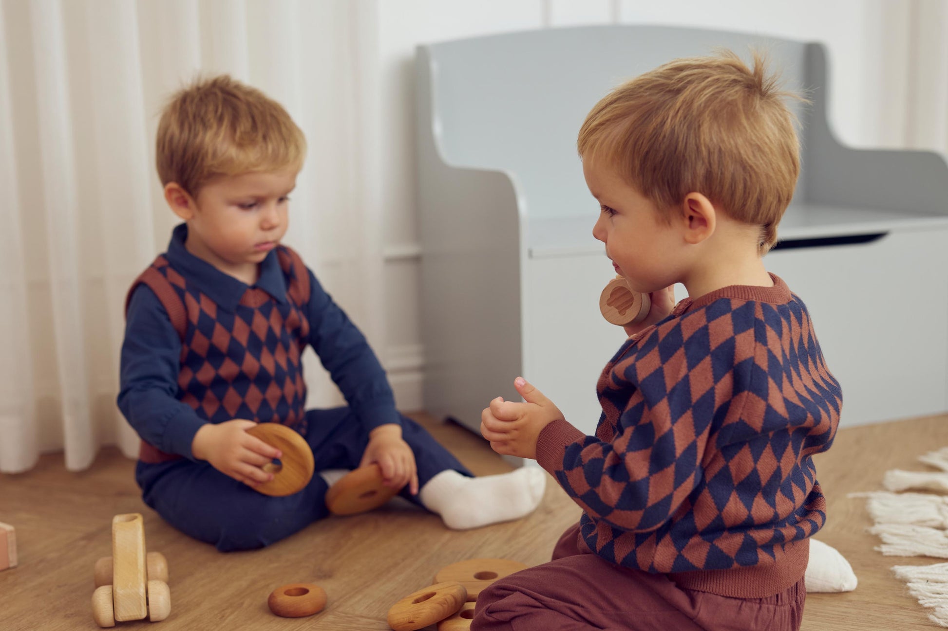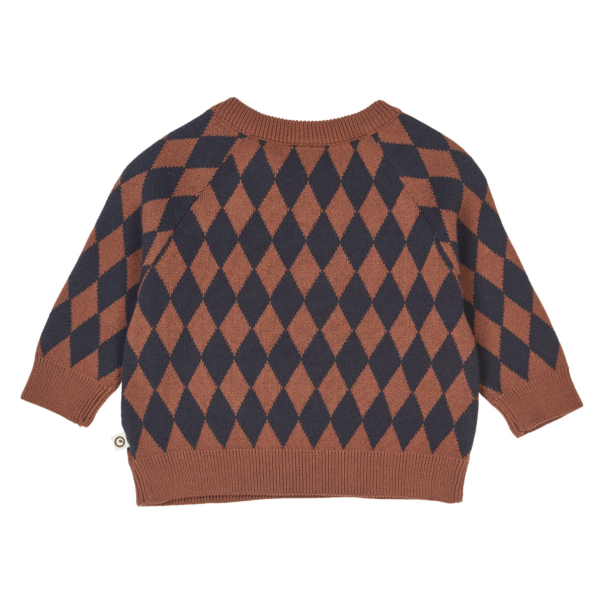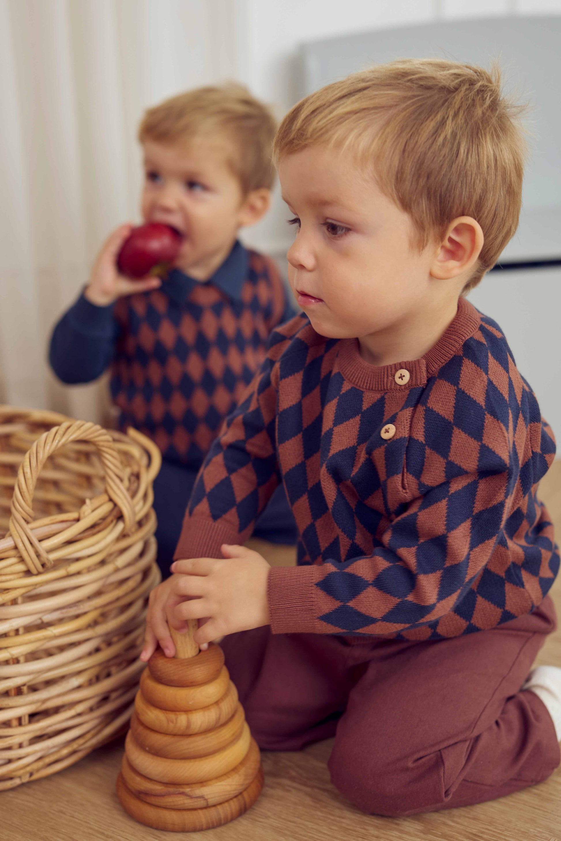 Dieser weiche Strickpullover im klassischen Rautendesign vereint stilvolle Optik mit hohem Tragekomfort. Die warme Farbgebung in Braun und Dunkelblau verleiht dem Pullover einen zeitlosen Charakter, der sich vielseitig kombinieren lässt.