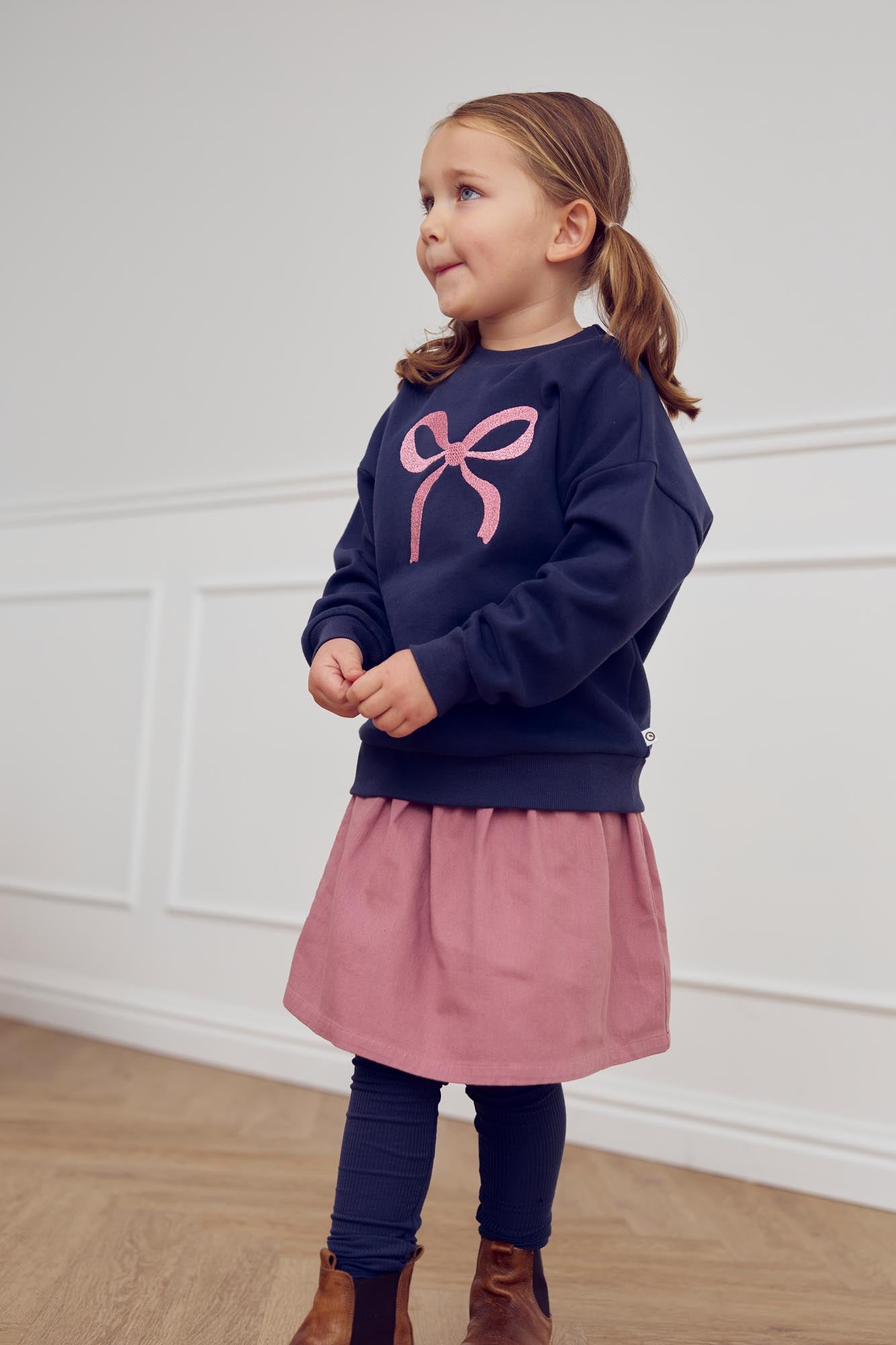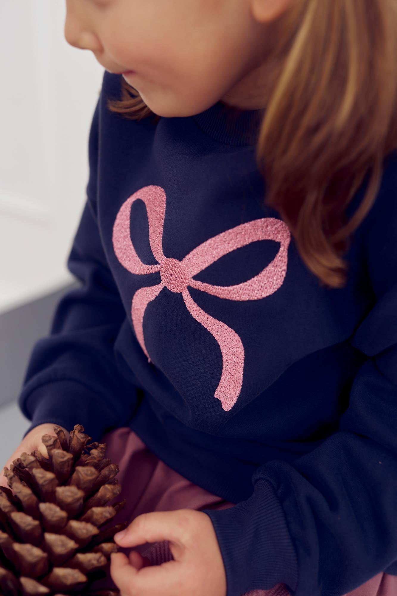 Ein klassischer Sweater mit liebevollem Detail: Dieses dunkelblaue Sweatshirt aus weicher Bio-Baumwolle wird durch die große rosa Schleife auf der Vorderseite zum charmanten Blickfang.