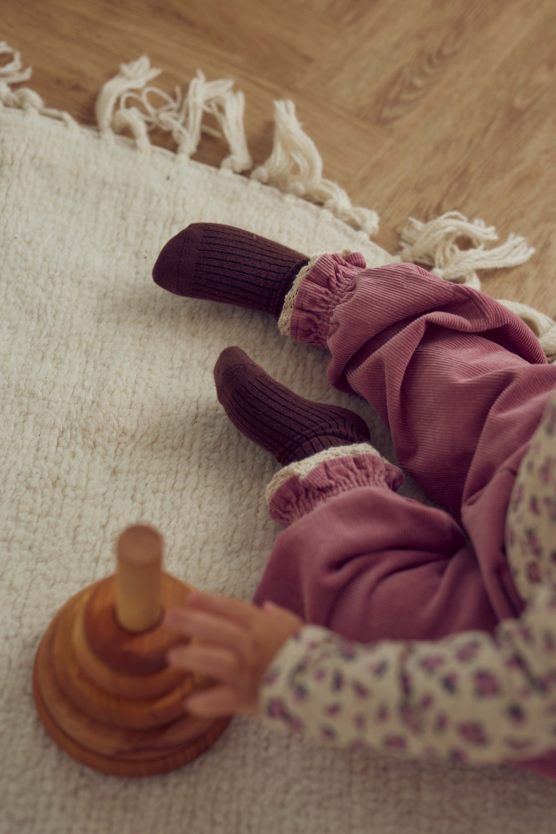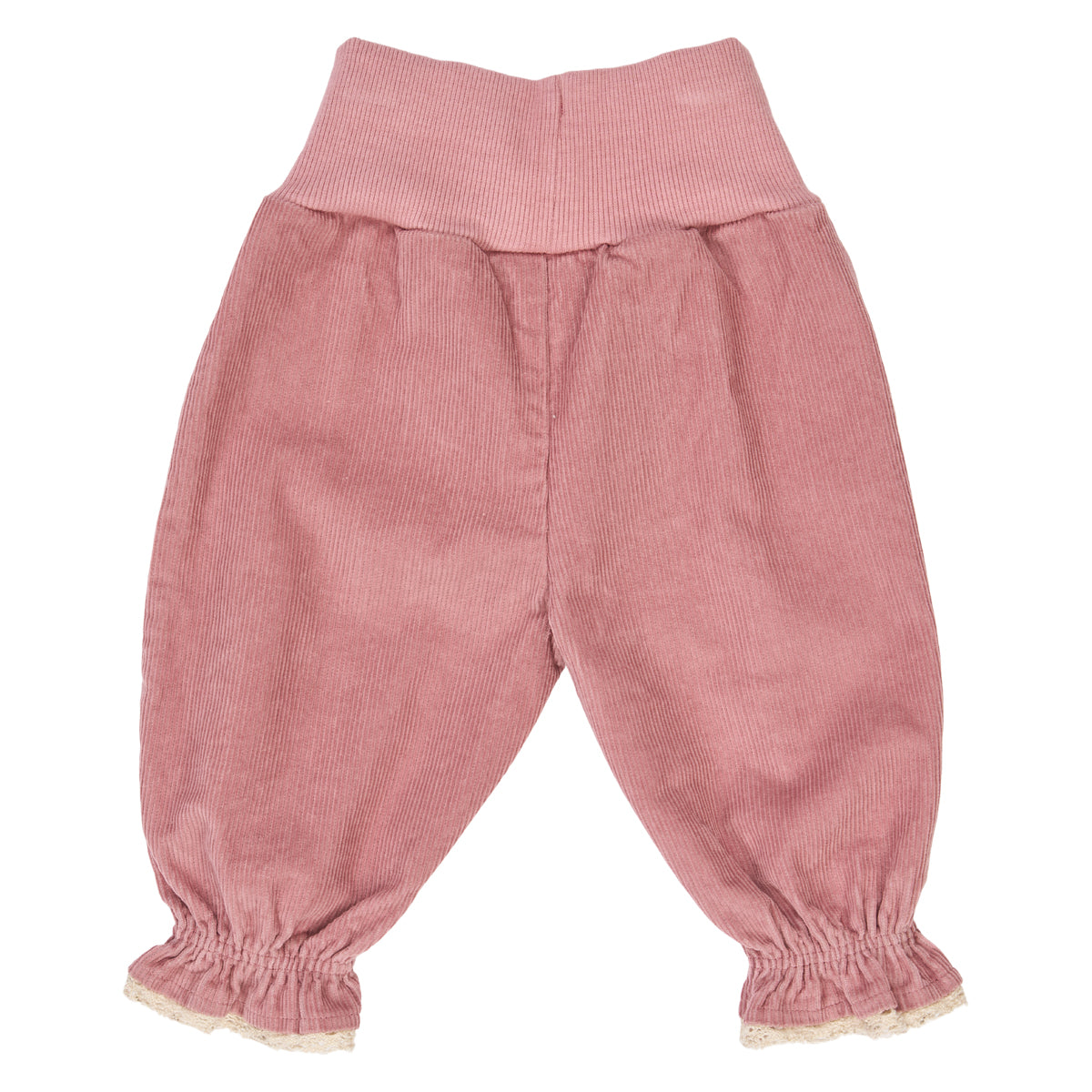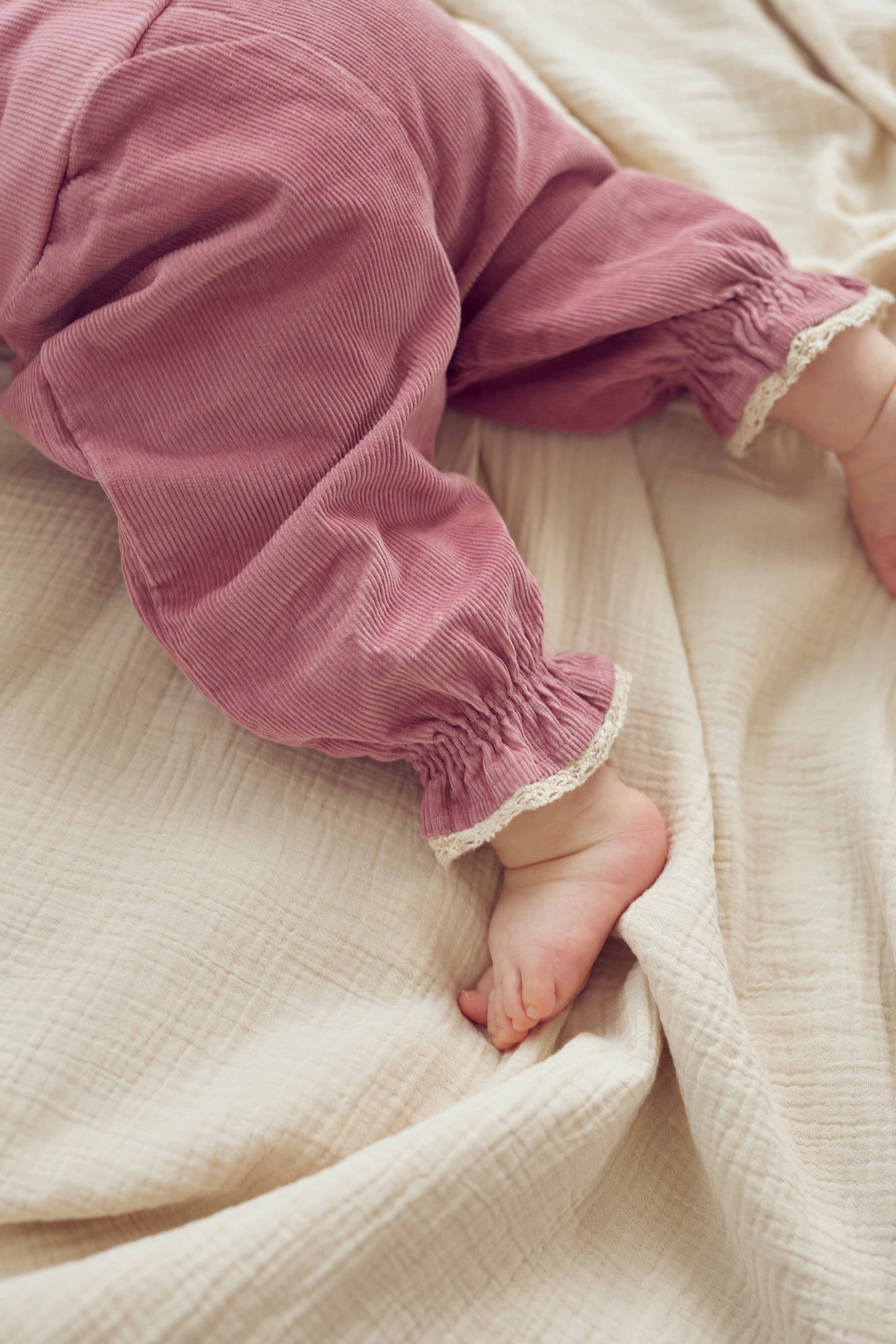 Diese roséfarbene Hose aus weichem Feincord ist ein echtes Wohlfühlteil für kleine Mädchen. Der breite, elastische Bund sitzt besonders bequem am Bauch und schenkt maximale Bewegungsfreiheit – ganz ohne Drücken oder Zwicken. Liebevolle Details wie die feinen Rüschen mit zarter Spitze an den Beinabschlüssen machen sie zu einem besonderen Hingucker!