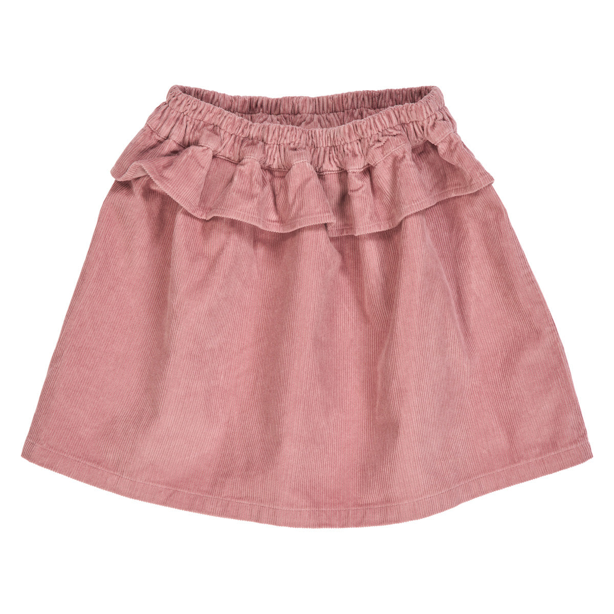 Dieser roséfarbene Rock aus feinem Cord ist ein echter Mädchentraum! Die sanfte Raffung am Bund und die verspielte Volantkante verleihen ihm einen herrlich leichten Schwung – perfekt für kleine Tänzerinnen und Wirbelwinde.