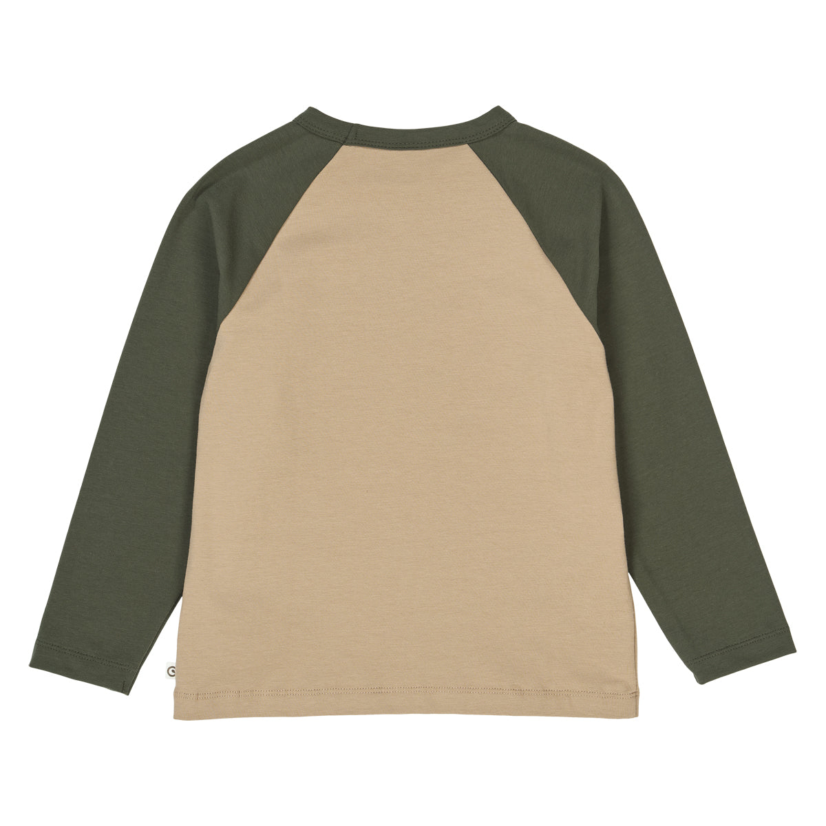 Ein sportlich-lässiges Longsleeve im Raglan-Stil: Die Kombination aus sandfarbenem Vorder- und Rückenteil und olivgrünen Ärmeln sorgt für einen natürlichen, zeitlosen Look.