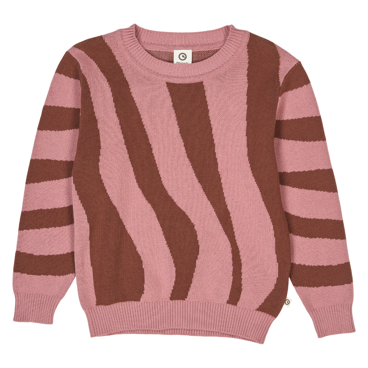 Ein echter Blickfang: Dieser Strickpullover aus reiner Bio-Baumwolle begeistert mit seinem außergewöhnlichen Zebramuster in Rosa und Schokobraun. Die fließenden Linien und Kontraste verleihen dem Design eine moderne, kreative Note – perfekt für kleine Trendsetterinnen und Modefreunde.