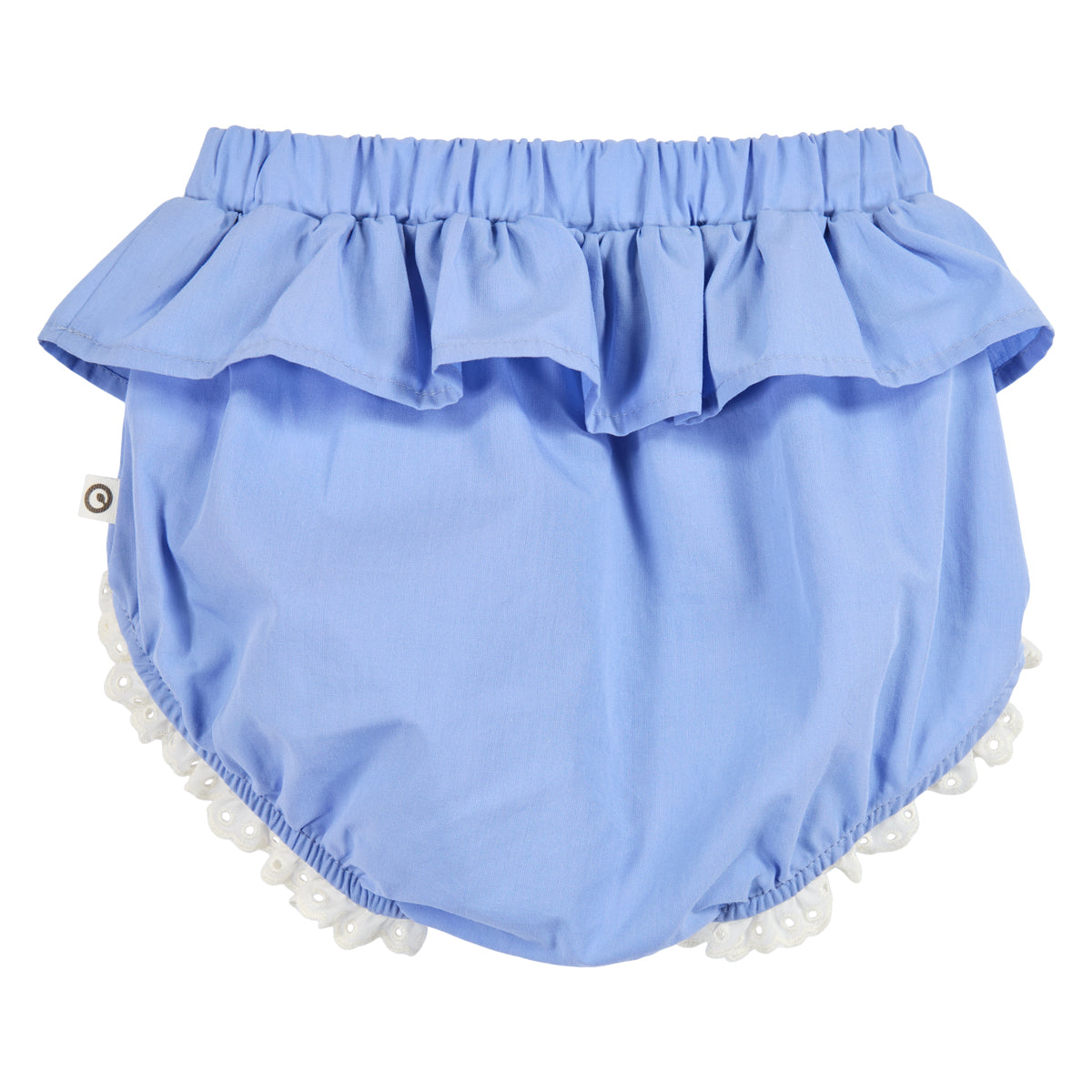 Die passende Bloomer in sanftem Blau rundet das Outfit perfekt ab. Mit elastischem Bund, hübscher Rüsche und feinen Spitzenabschlüssen an den Beinöffnungen entsteht ein nostalgisch-verspielter Look mit viel Bewegungsfreiheit.