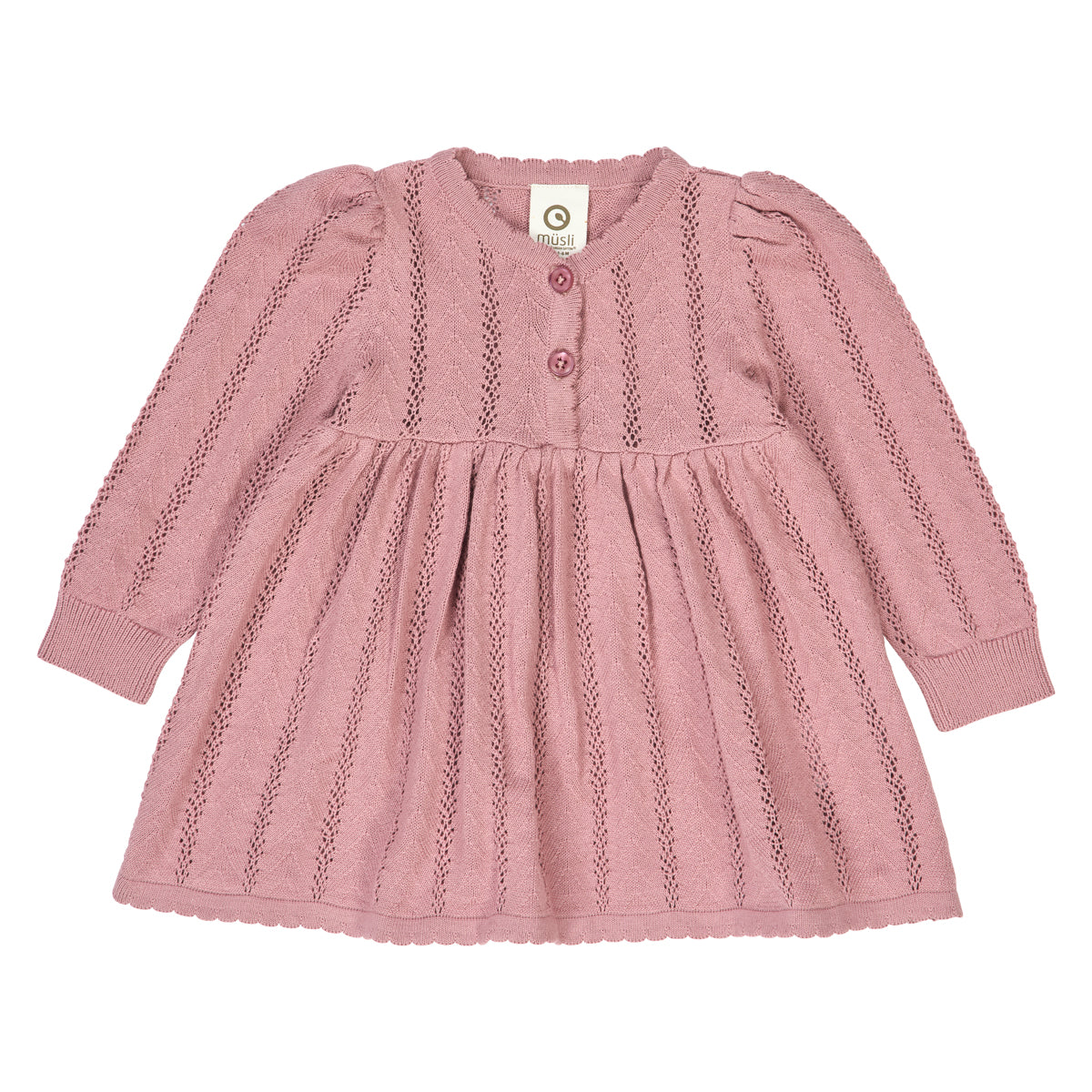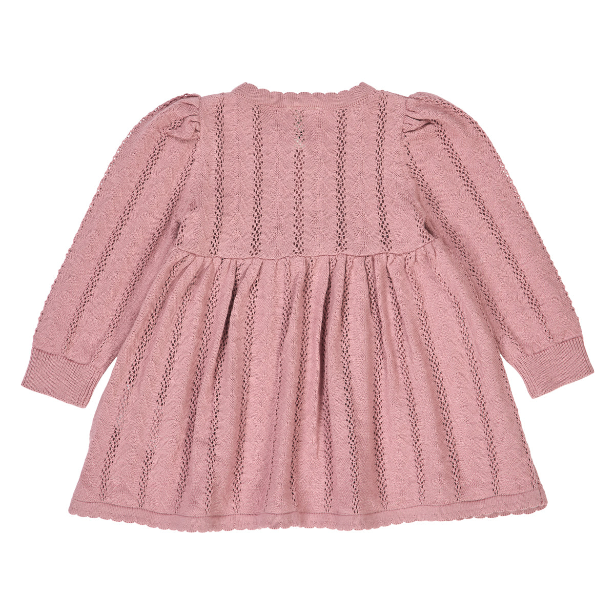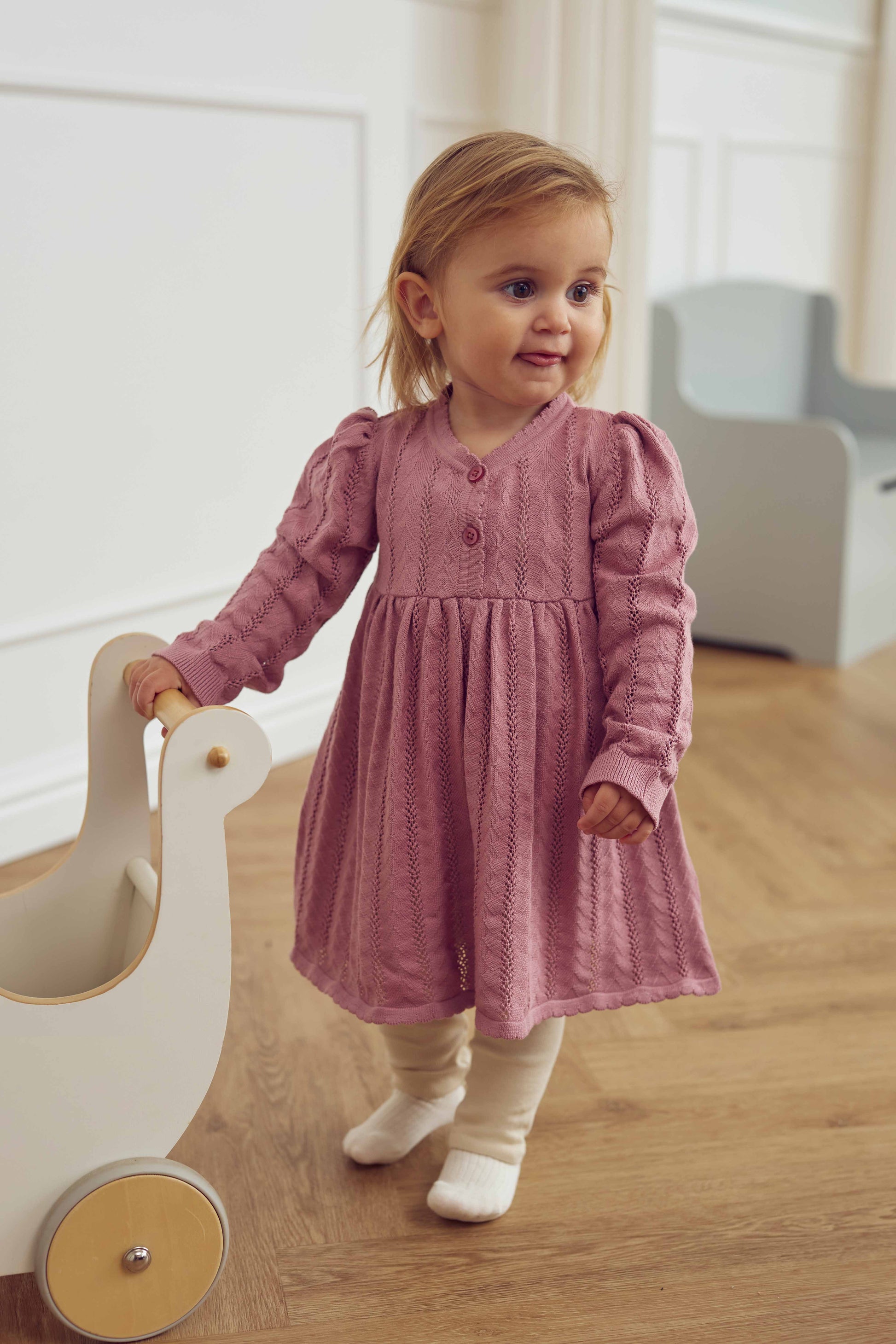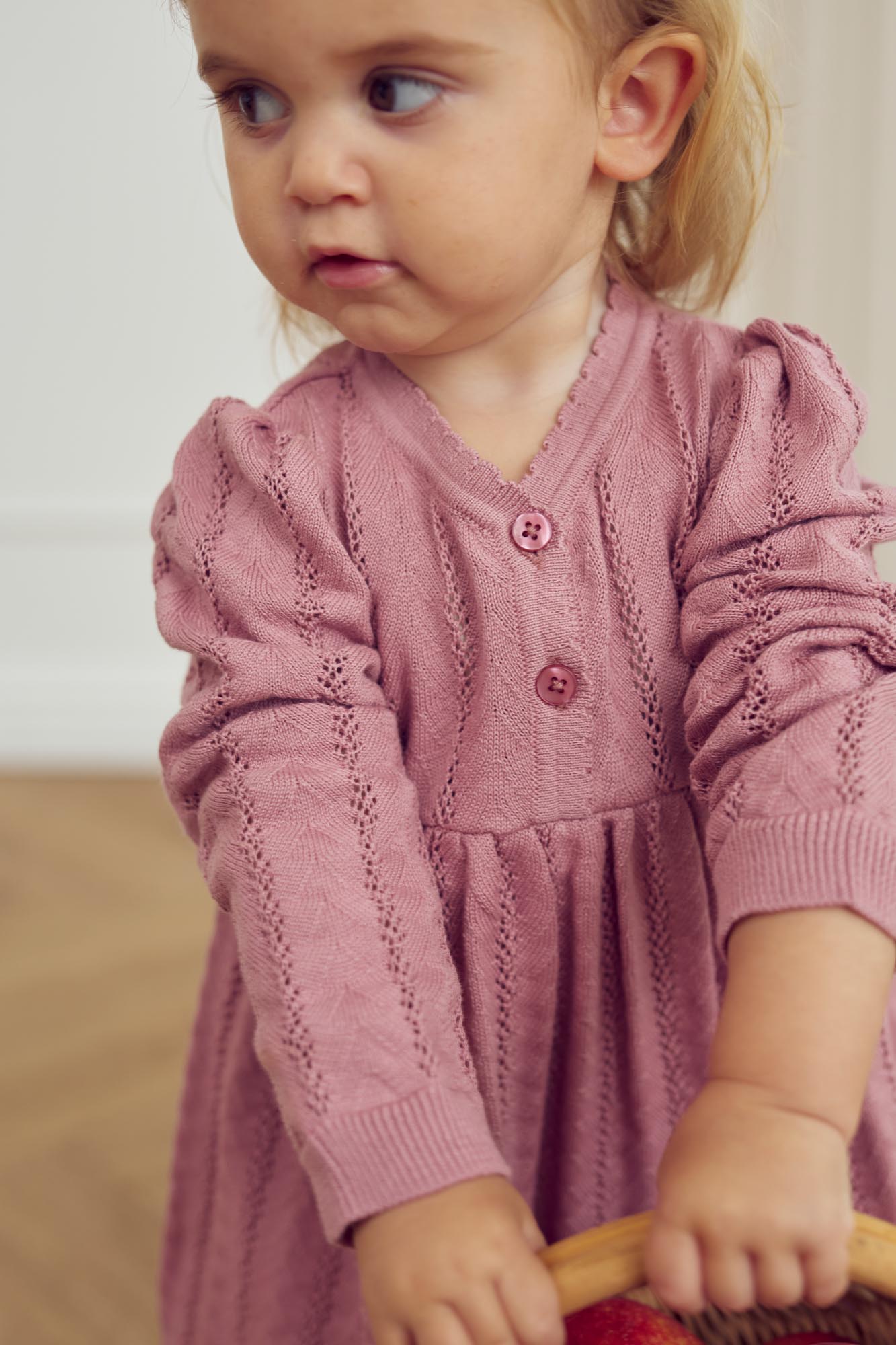 Ein zartes Lieblingsstück für die kühlere Jahreszeit: Dieses gestrickte Kleid aus weicher Bio-Baumwolle begeistert mit feinem Ajourmuster, liebevollen Details und einer klassischen Passform. Die leicht gepufften Ärmel, die kleine Knopfleiste vorn und die feine Wellenkante am Halsausschnitt verleihen dem Kleid eine nostalgisch-verspielte Note.