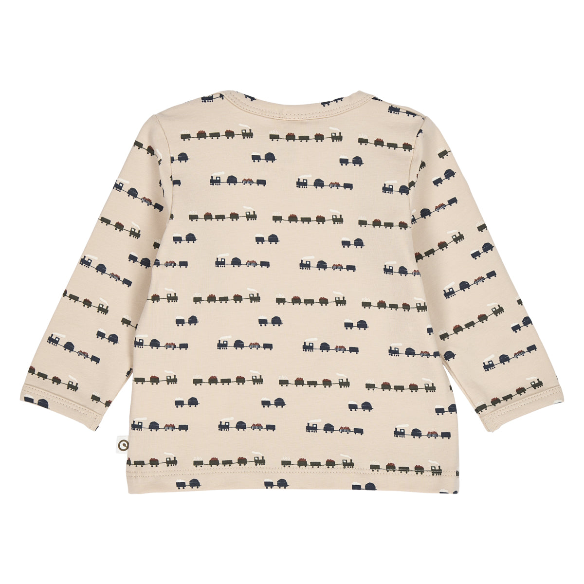 Dieses süße Langarmshirt begeistert kleine Entdecker mit seinem liebevollen Zug-Print in gedeckten Farben. Die kleinen Lokomotiven und Waggons tuckern fröhlich über das weiche Shirt und laden zum Träumen, Spielen und Staunen ein 🚋💭