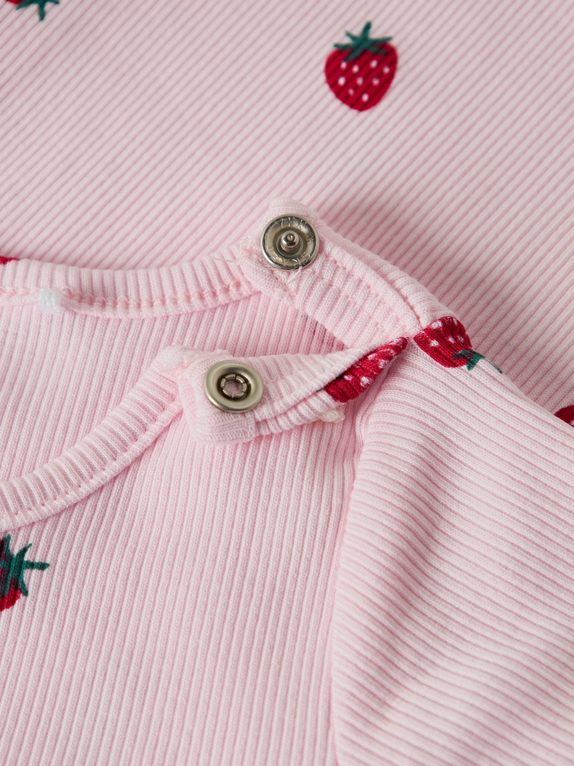 Dieser süße Kurzarm-Body in zartem Rosa ist mit einem verspielten Erdbeerprint versehen und bietet dank der elastischen Rippstruktur besonders angenehmen Tragekomfort. Die feinen Wellenabschlüsse an den Ärmeln mit kontrastfarbener Naht setzen charmante Akzente und unterstreichen den verspielten Look.