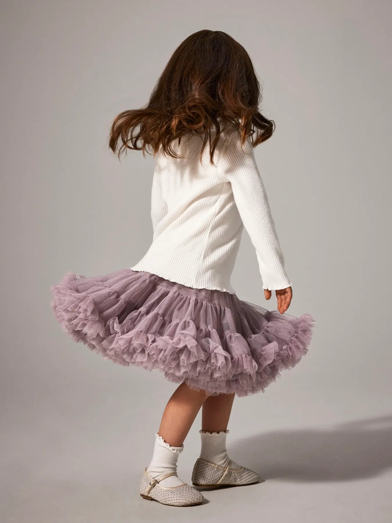 Ein Hauch von Zauber in zartem Fliederton 💜 – dieser traumhafte Rock lässt kleine Tänzerinnenherzen höherschlagen! Die vielen Lagen aus feinem, weichem Tüll sorgen für einen wunderbar fluffigen Fall, der bei jeder Drehung wunderschön mitschwingt. 🌸