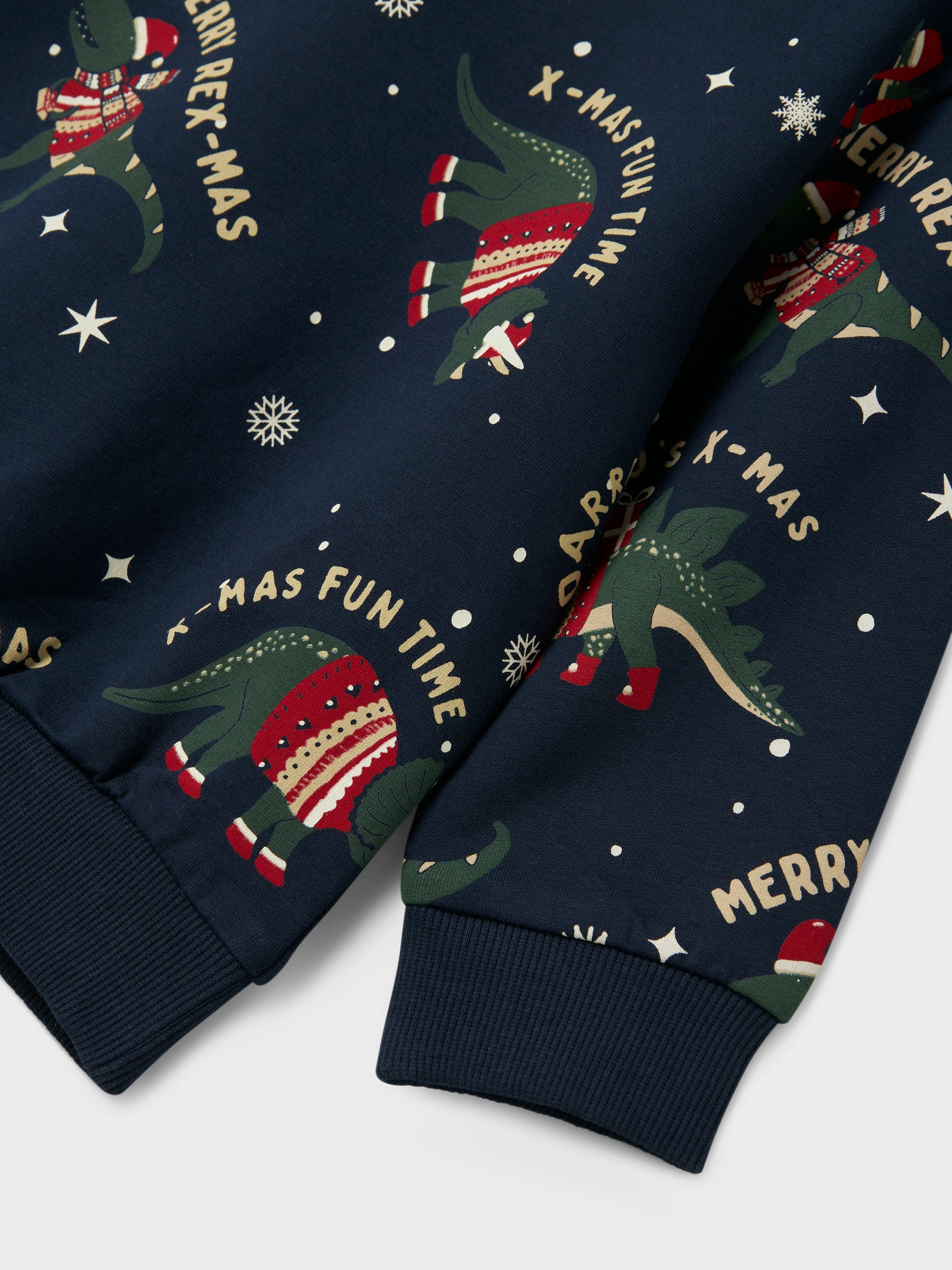 Ein Sweater voller kleiner Details wie "DINO'S X-MAS", die Kinderaugen zum Strahlen bringen – und das in einem tiefen Nachtblau, das die festlichen, grünen Dinos wunderschön zur Geltung bringt. 🦕