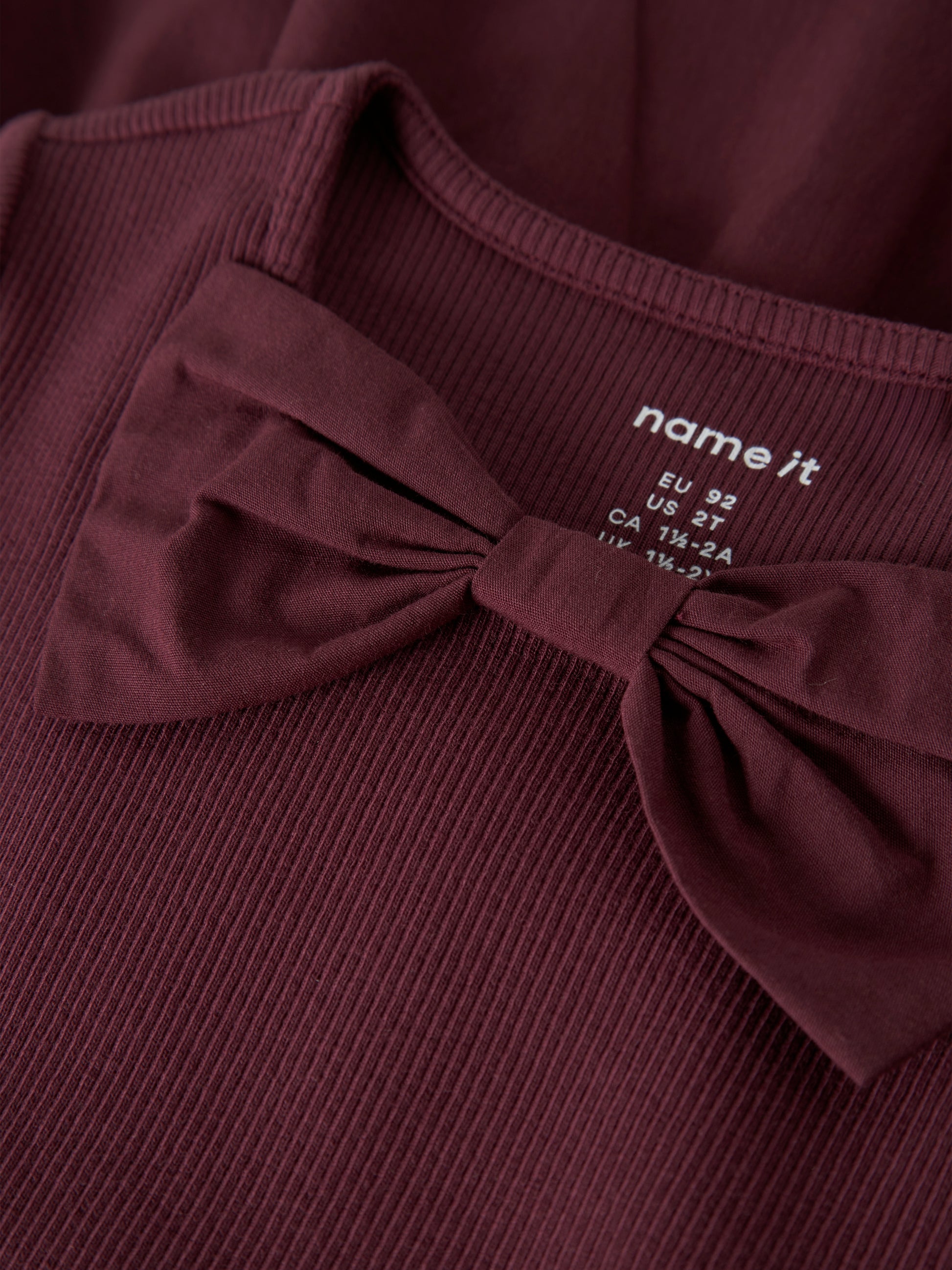 Ein absoluter Hingucker ist die große, schlichte Schleife 🎀 am Ausschnitt, die dem Kleid einen besonders süßen und festlichen Charme verleiht. Das Oberteil ist in einer feinen Rippstruktur gehalten, was für eine tolle Textur sorgt, während der Rockteil weich fällt. ✨