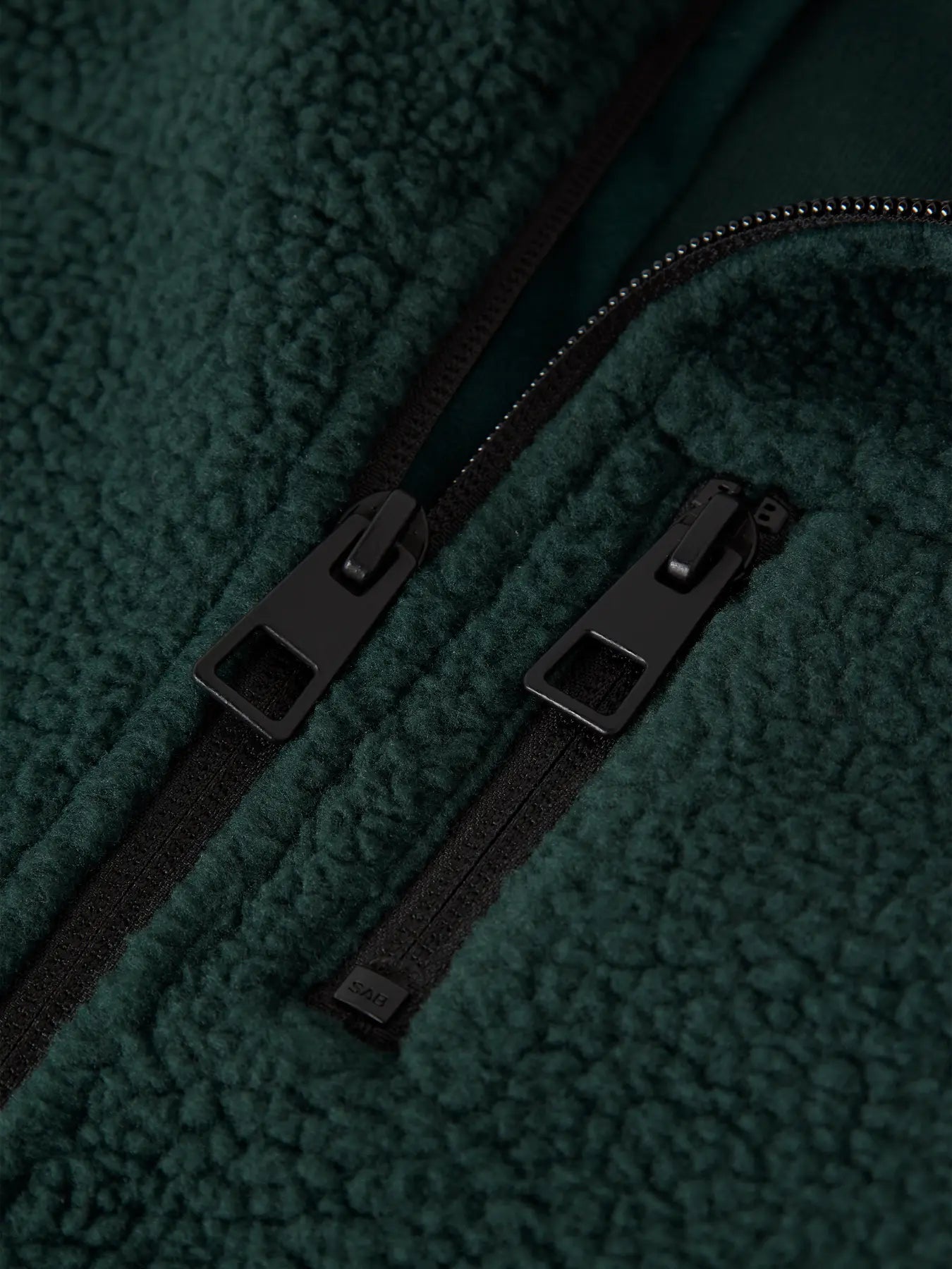 In einem tiefen, trendigen Dunkelgrün präsentiert sich diese kuschelige Fleece-Jacke als treuer Begleiter für alle kleinen Abenteurer. Das weiche, hochflorige Teddy-Fleece hält wohlig warm und lädt zum Einkuscheln ein – perfekt für kühle Herbsttage und frische Waldspaziergänge.