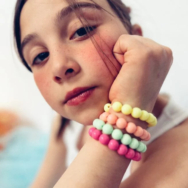 Die elastischen Armbänder lassen sich kinderleicht an- und ausziehen und passen sich zarten Kinderhändchen wunderbar an. Ob in frischem Mintgrün, sonnigem Gelb, leuchtendem Orange oder süßem Pink – jedes Armband erzählt seine eigene kleine Farbgeschichte 🍭🌼🌸🍊