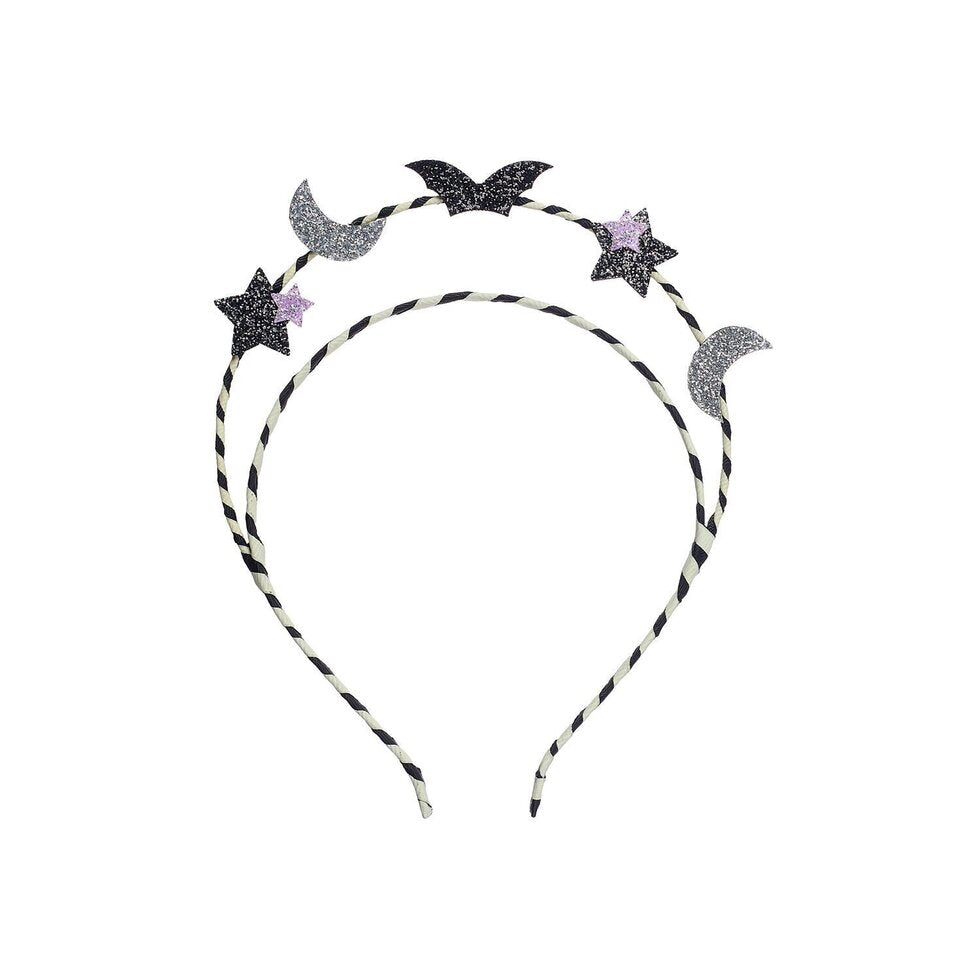 Ein Haarreif voller Magie! Auf dem schwarz-weiß gedrehten Reif tanzen funkelnde Sterne, glitzernde Monde, ein lilafarbenes Sternchen und sogar eine kleine Fledermaus 🦇.