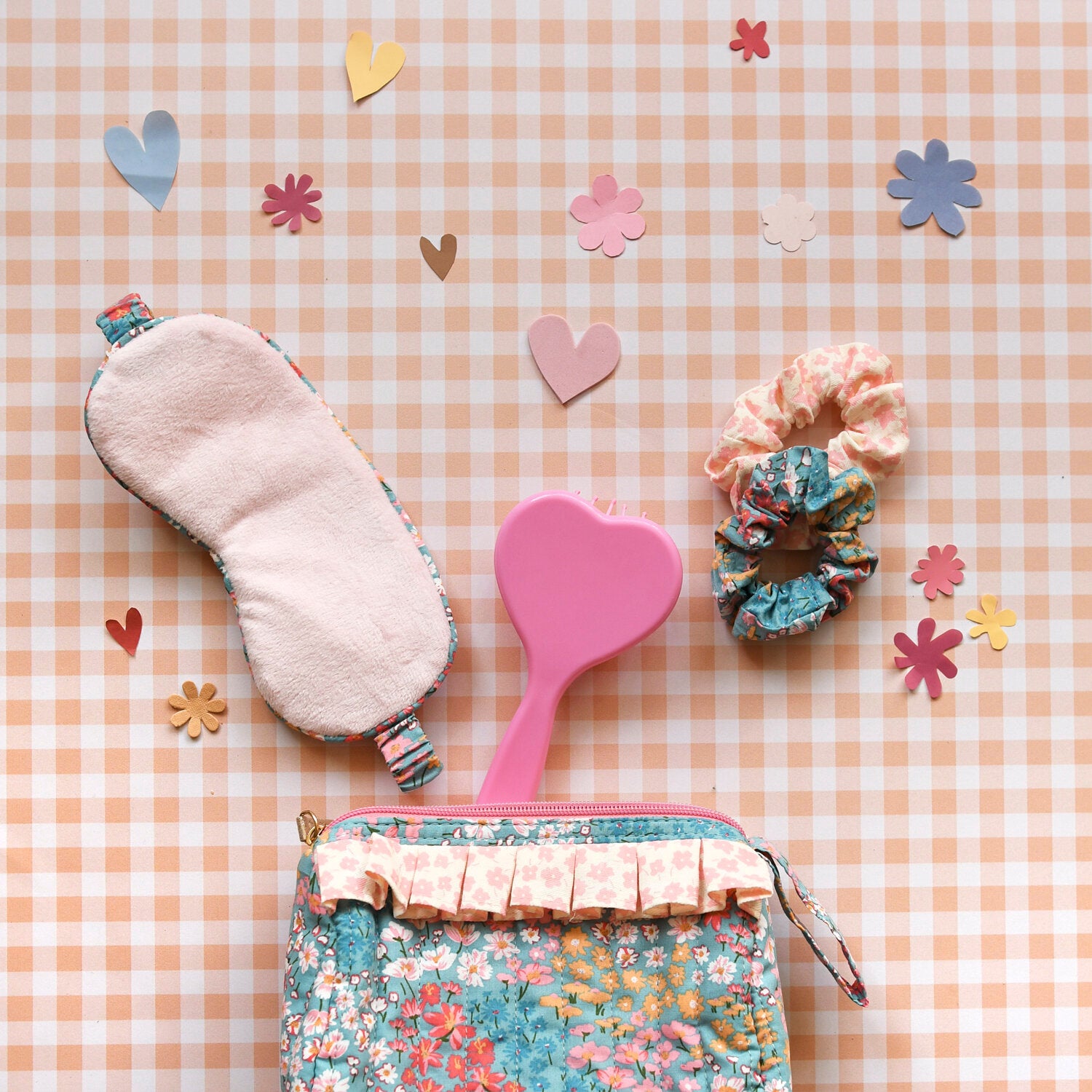 Dieses zauberhafte Set bringt alles mit, was man für eine kleine Wohlfühl-Auszeit braucht: eine weiche Schlafmaske, zwei süße Scrunchies, eine Herzbürste und eine wunderschön gesteppte Tasche mit Rüschen.