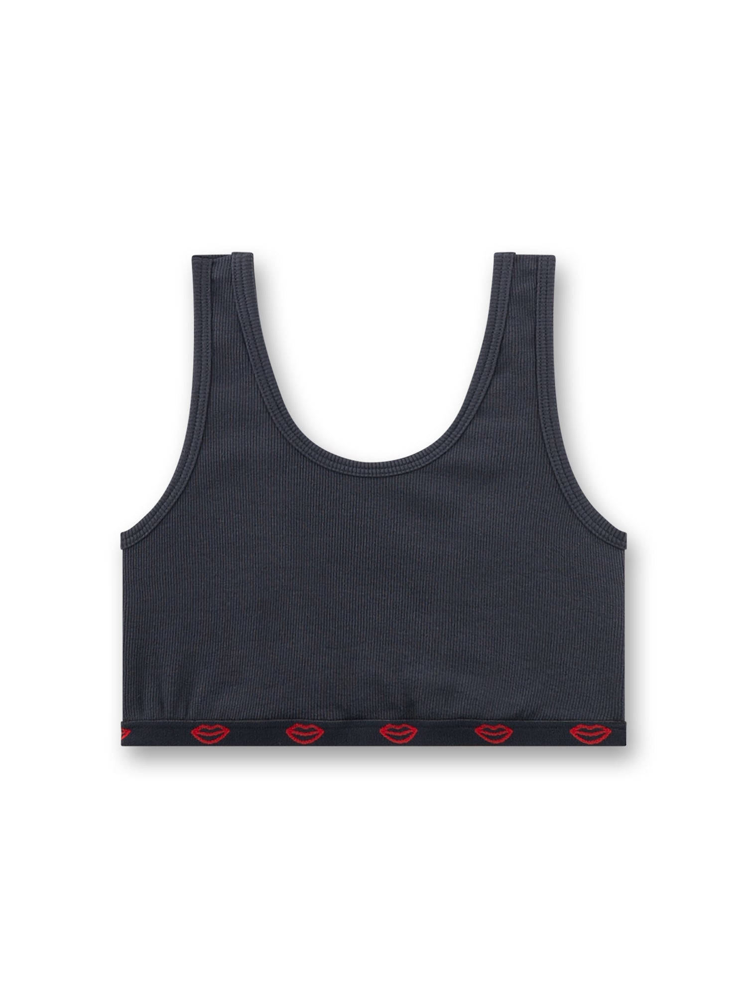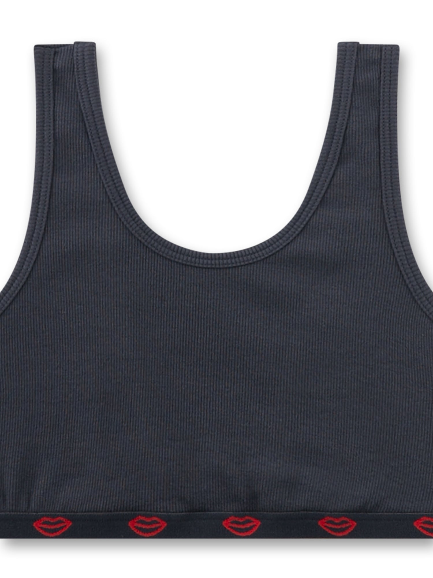 Hergestellt aus elastischer Rippe mit 95 % Baumwolle und 5 % Elasthan, ist es angenehm weich, dehnbar und besonders bequem für den Alltag. Breite Träger und ein gewebter Elastikbund sorgen für sicheren Halt, während der Rücken mittig frei ausgeschnitten ist und die Träger sich erst unten am Bund verbinden – ein lässiger, jugendlicher Look.
