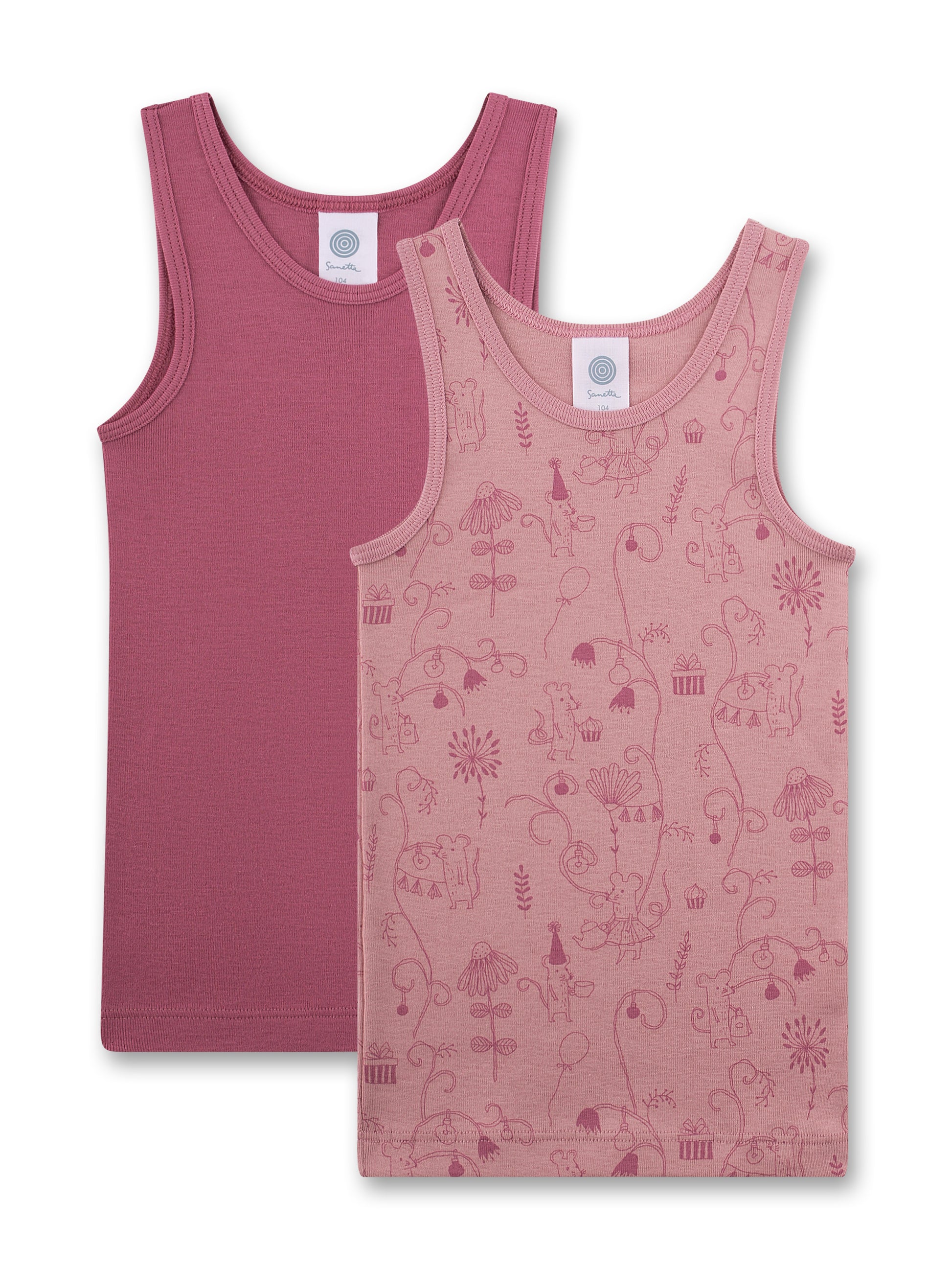 Diese beiden Unterhemden zaubern schon beim Anziehen ein Lächeln ins Gesicht. Eines ganz schlicht in einem warmen Beerenton, das andere mit detailverliebtem Feen-Print: kleine Mäuschen, Blüten und Pilze laden zum Träumen ein und machen jedes Hemdchen zu einem kleinen Abenteuer.