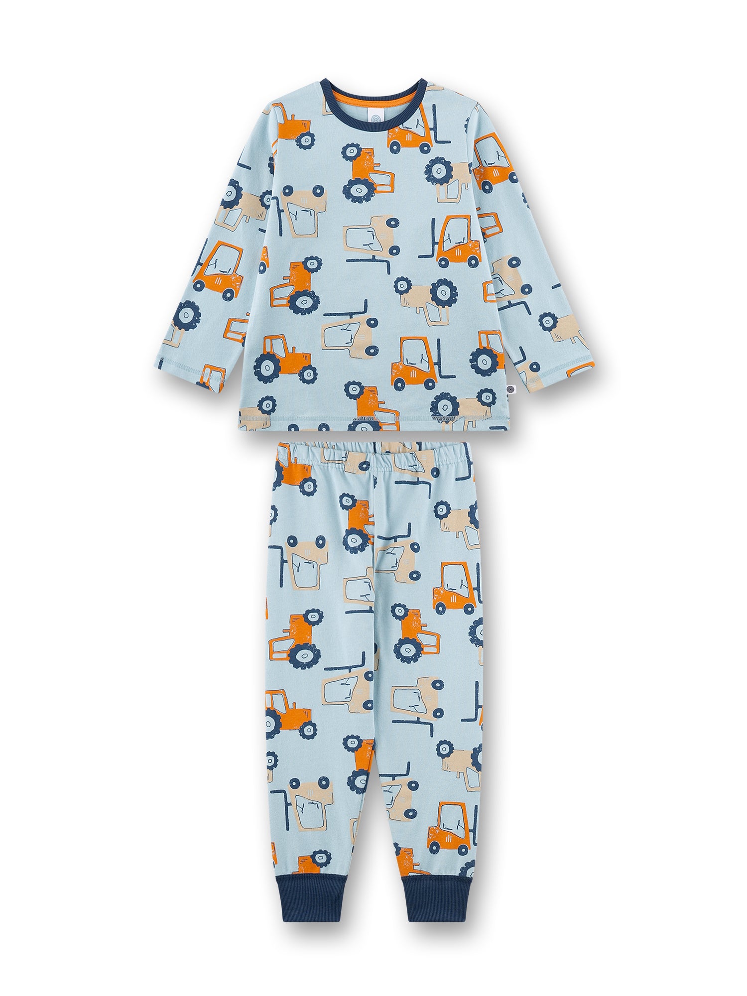 Dieser gemütliche Schlafanzug ist wie gemacht für kleine Baustellenfans. Das langärmelige Oberteil und die passende Hose sind rundum mit bunten Baufahrzeugen bedruckt – in fröhlichen Farben auf hellblauem Grund.