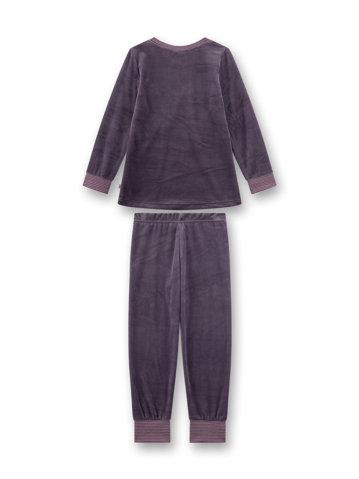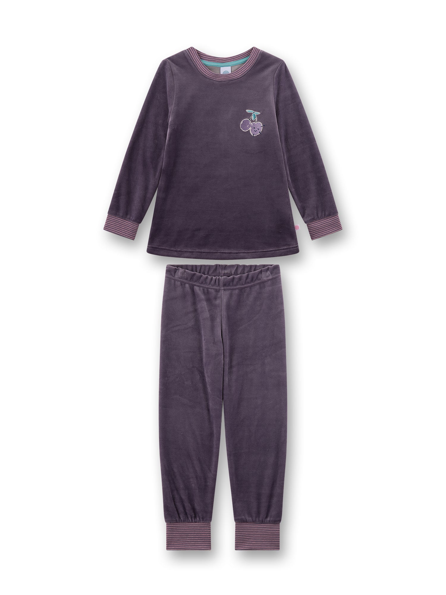 Dieser kuschelweiche Schlafanzug in sattem Pflaumenton ist ideal für gemütliche Abende und erholsame Nächte. Das Oberteil ist mit einer kleinen, fröhlichen Kirschen-Stickerei verziert, die charmant auf der Brust platziert ist. Gestreifte Rippbündchen an Halsausschnitt, Ärmeln und Beinabschlüssen setzen verspielte Akzente.